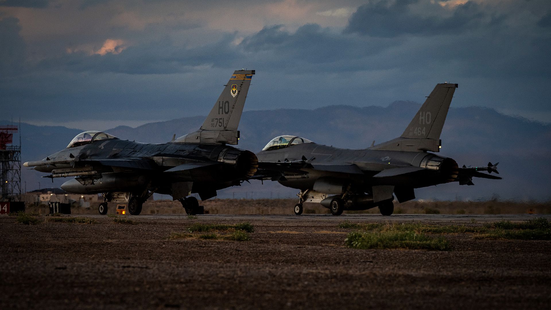Two U.S. Air Force F-16 Fighting Falcons assigned to the 54th Fighter Group wait on a runway after an evening flight at Holloman Air Force Base, New Mexico, May 7, 2025. The 54th FG is responsible for producing a majority of the Air Force’s F-16 fighter pilots. (U.S. Air Force photo by Airman Elijah Strickland)