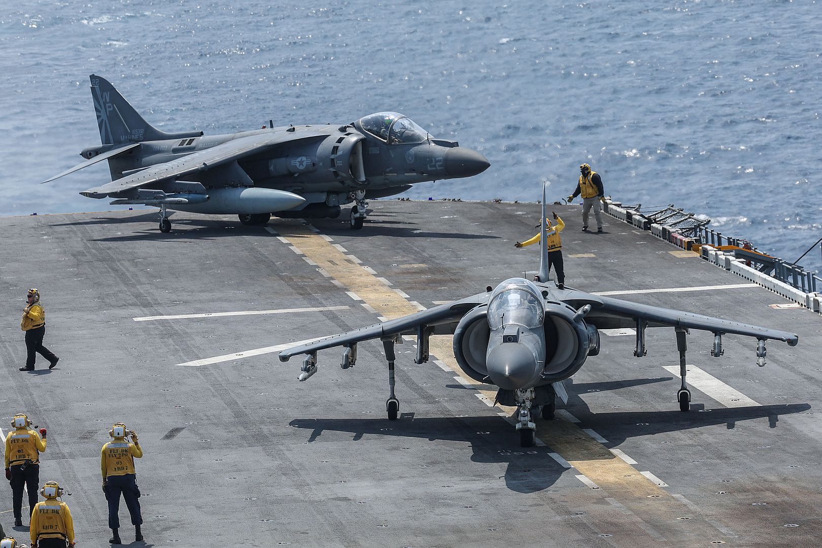ATLANTIC OCEAN (May 20, 2025) Sailors, assigned to the Wasp-class amphibious assault ship USS Iwo Jima (LHD 7), direct two AV-8B Harriers, assigned to the “Bulldogs” of Marine Attack Squadron (VMA) 223, into position for take-off during flight operations aboard Iwo Jima. Iwo Jima Amphibious Ready Group (ARG) and 22nd Marine Expeditionary Unit (MEU) are underway in the Atlantic Ocean completing integrated naval warfighting training. ARGMEUEX prepares integrated naval task forces for sustained, high-end Joint and combined combat. Integrated naval training provides combatant commanders and the Commander-in-Chief highly capable forces that deter adversaries, underpin American security and economic prosperity, and reassure Allies and partners. (U.S. Navy photo by Mass Communication Specialist 2nd Class Joseph T. Miller)