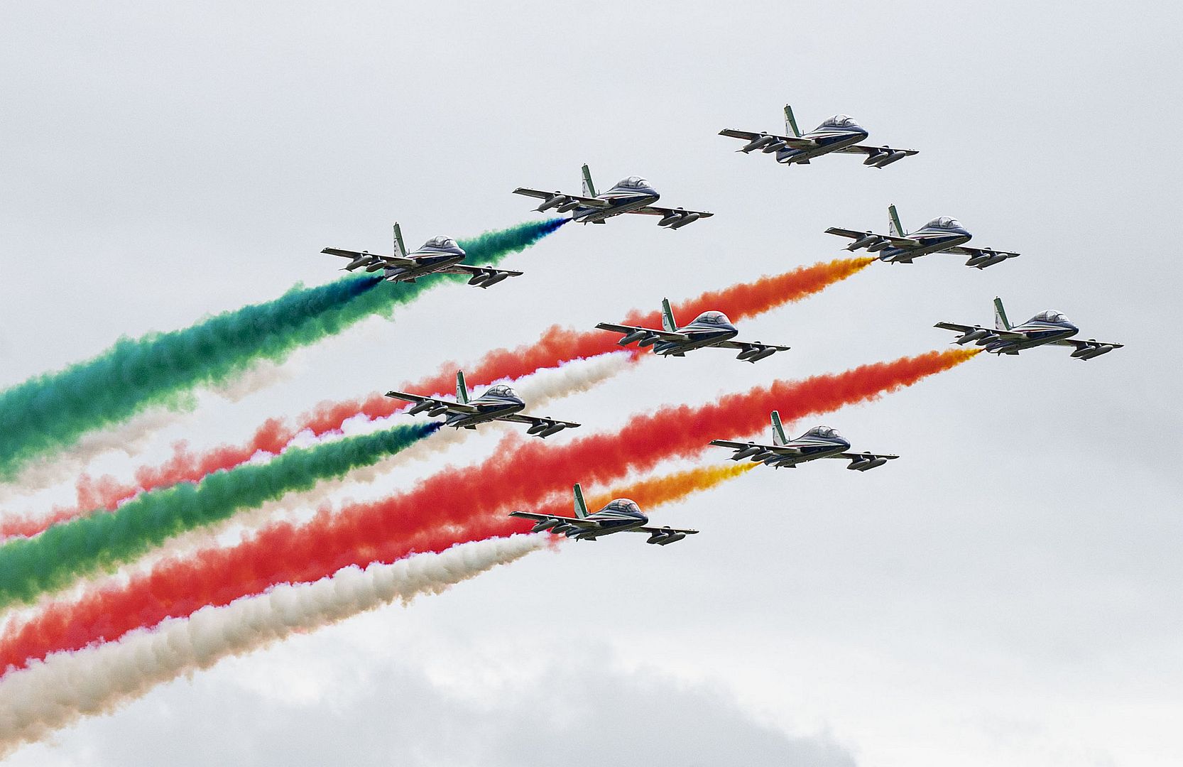 The Italian aerobatic display team, Frecce Tricolori, deploys colored smoke in formation during an air demonstration as part of the 31st Fighter Wing 31st Anniversary celebration at Aviano Air Base, May 22, 2025. The 31st Anniversary was an opportunity for the 31st FW to reflect on and celebrate the Wing’s long legacy of honor. (U.S. Air Force photo by Staff Sgt. Brooke Rogers)