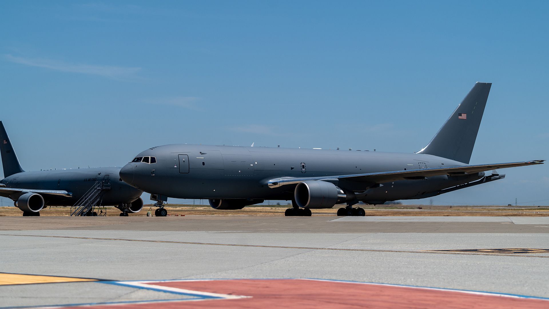 A U.S. Air Force KC-46A Pegasus taxis down the flight line at Travis Air Force Base, California, May 16, 2025. Travis AFB received one of two new KC-46 air frames, further modernizing aerial refueling capabilities for the Department of Defense. (U.S. Air Force photo by Airman 1st Class Ashley Rowell)