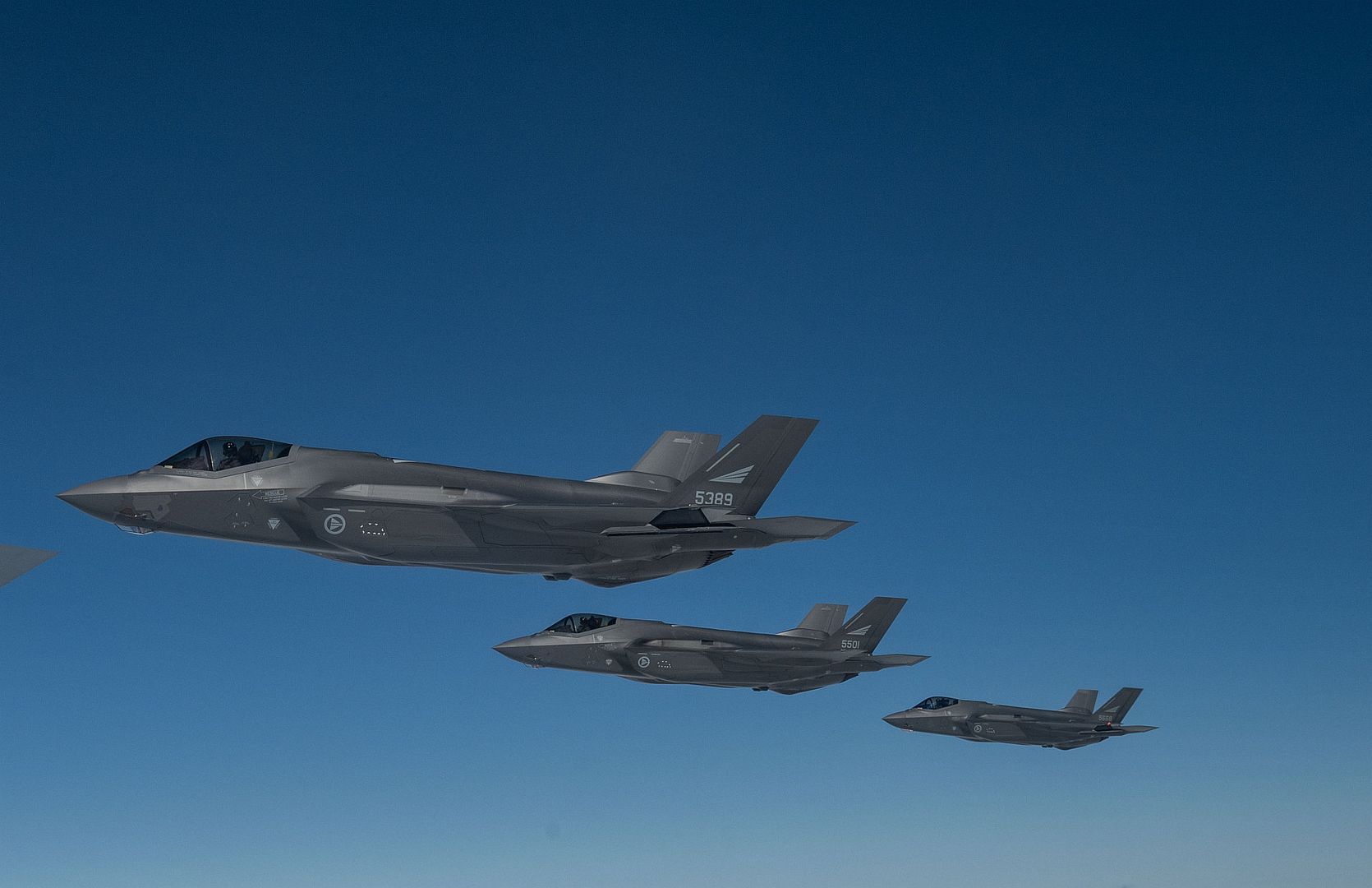 Three Royal Norwegian Air Force F-35 Lightning IIs fly alongside a U.S. Air Force KC-135 Stratotanker from the 100th Air Refueling Wing, RAF Mildenhall, England, over the Norwegian Sea, May 20, 2025. The mission underscored NATO’s collective readiness and the vital role of U.S. aerial refueling assets in extending allied airpower across the European theater. (U.S. Air Force photo by Tech. Sgt. Jesenia Landaverde)
