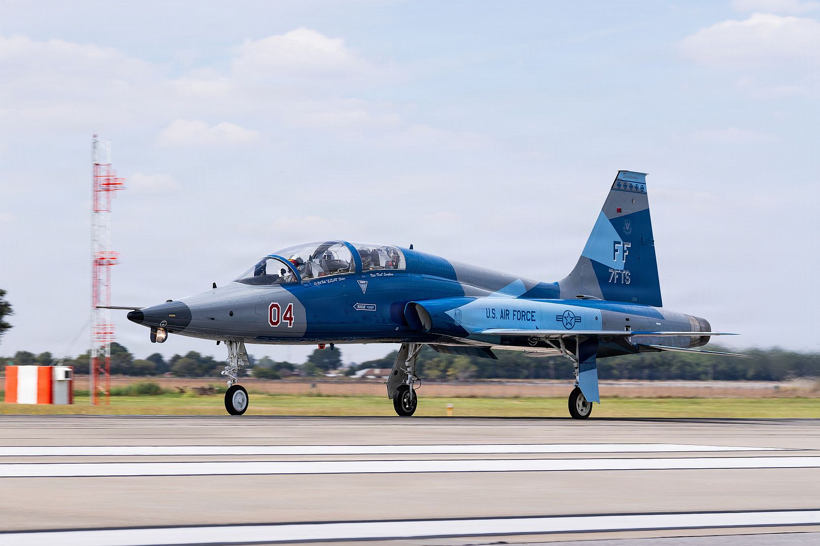 A U.S. Air Force T-38 Talon assigned to the 7th Fighter Training Squadron, Joint Base Langley-Eustis, Virginia, takes off from Vance Air Force Base, Okla., Sept. 29, 2025. The T-38 pilot visited Vance along with F-22 pilots to conduct a capability brief for undergraduate student pilots. (U.S. Air Force photo by 2nd Lt. Connor Brezenski)