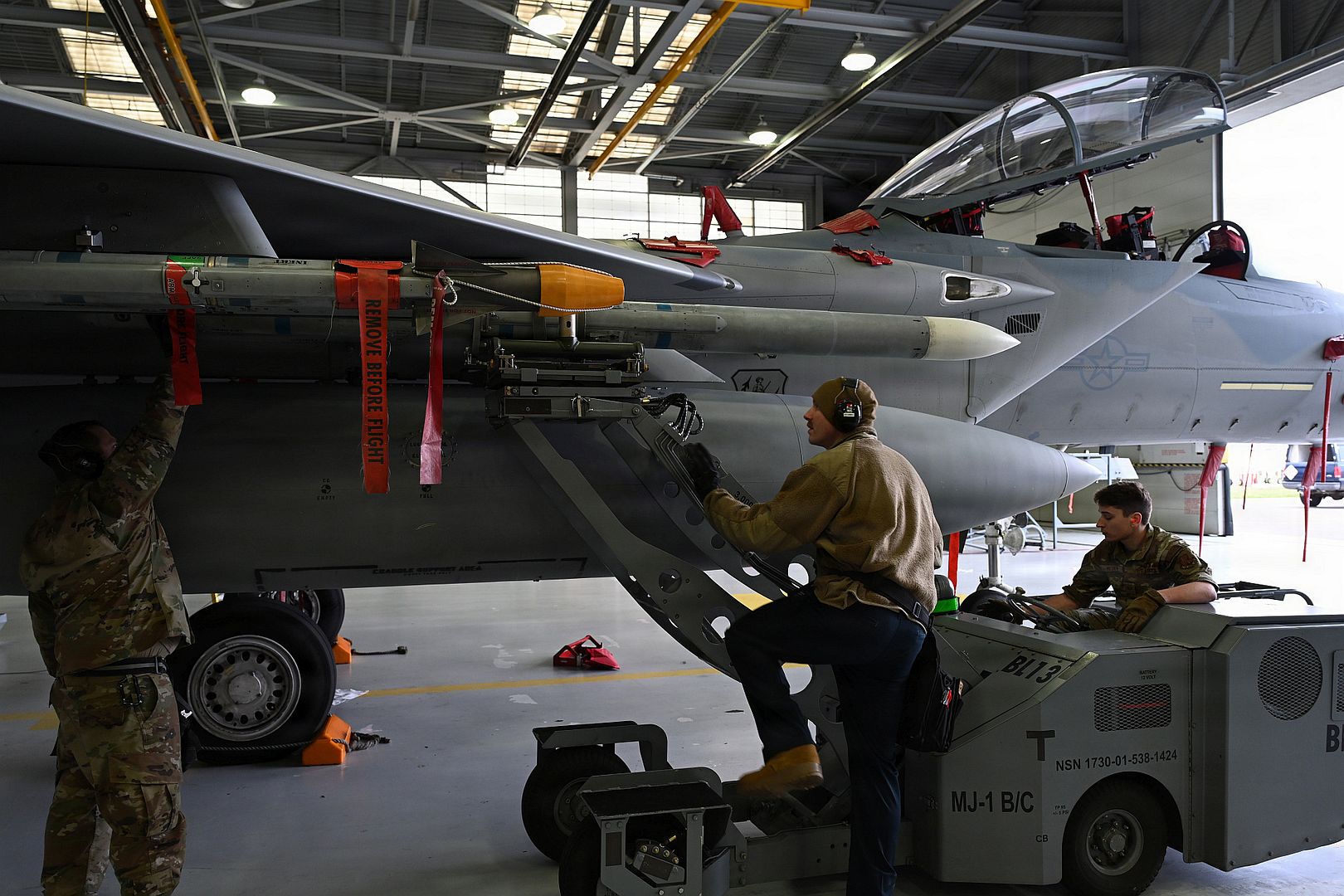 Lead Standardized Team Chief, Master Sgt. Morgan Annas (Left), Squadron Lead Crew Chief, Tech. Sgt. Brandon Beran (Middle) and Squadron Lead Crew Chief Three Man, Staff Sgt. Zachary Meuer (Right) Loads a missile on pylon one of an F15-EX on February 20, 2026 at Portland Air National Guard Base, Ore. This marks a historic moment where pylons one and nine were loaded on an operational F15-EX for the first time, increasing the aircraft's missile carrying capacity from eight to 12. (U.S. Air National Guard photo by Airman Casey Burruel)