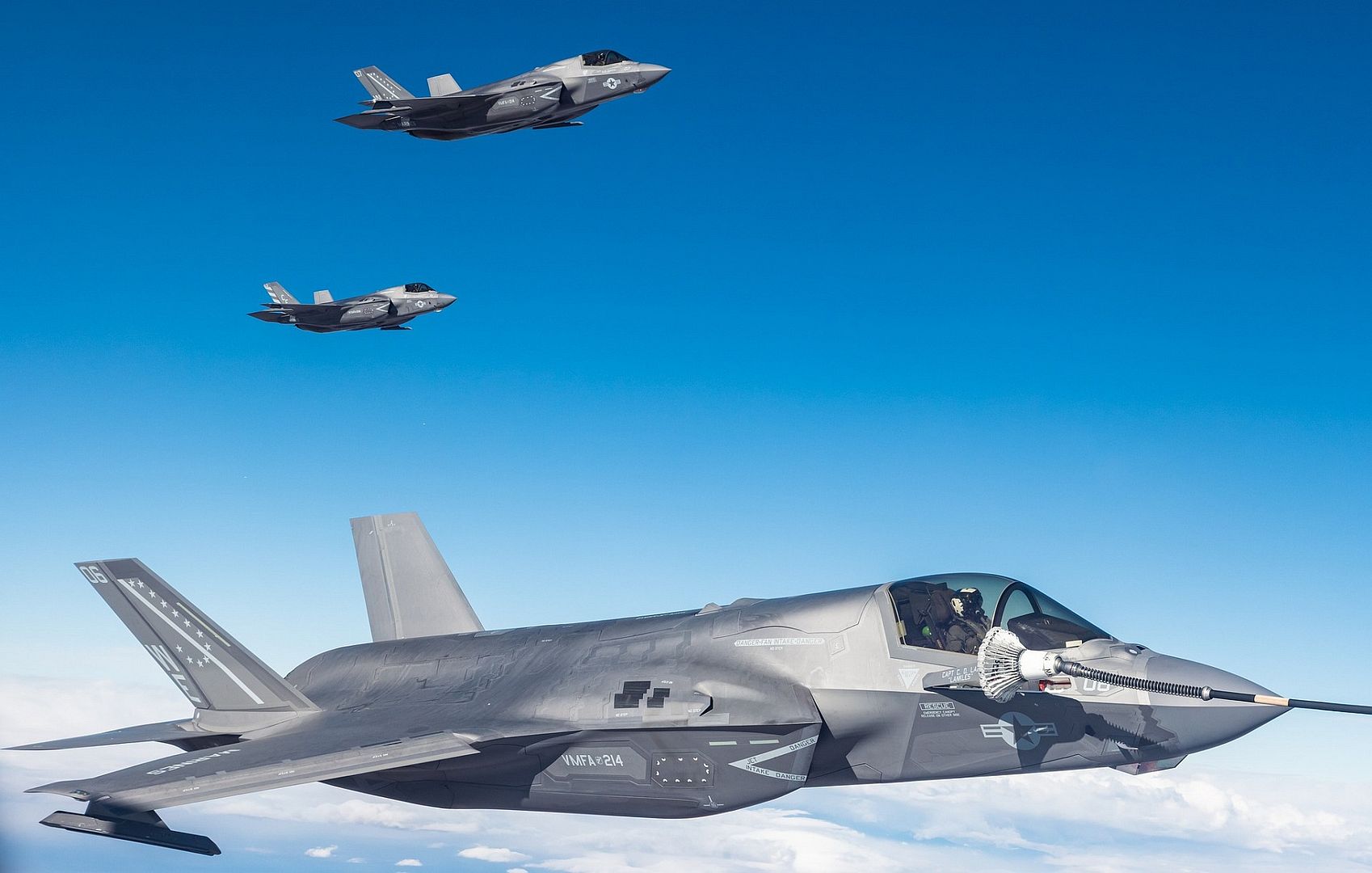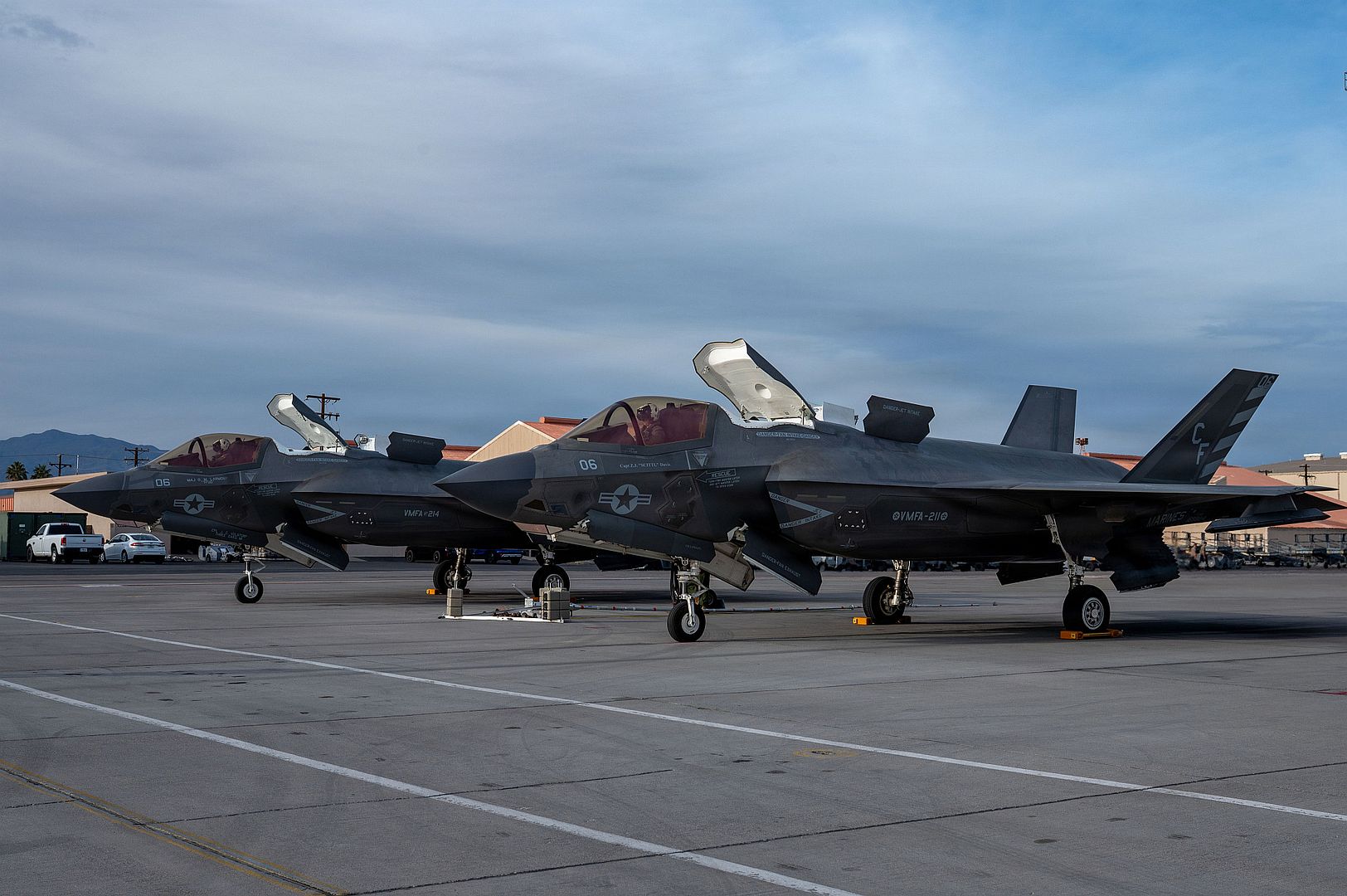 Two U.S. Marine Corps F-35B Lightning II, assigned to Marine Fighter Attack Squadron 211 (VMFA-211), Marine Corps Air Station Yuma, Arizona, line up after their recovery at Nellis Air Force Base, Nevada, in support of Red Flag-Nellis 26-1, Feb. 9, 2026. Red Flag increases interoperability between Allied nations and across the joint force as service members train together in high-end, realistic scenarios. (U.S. Air Force photo by Airman 1st Class Heather Amador Paulino)