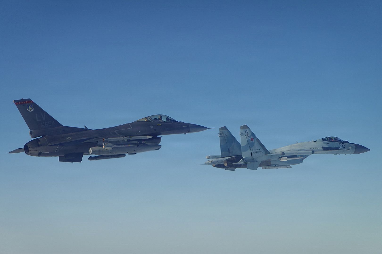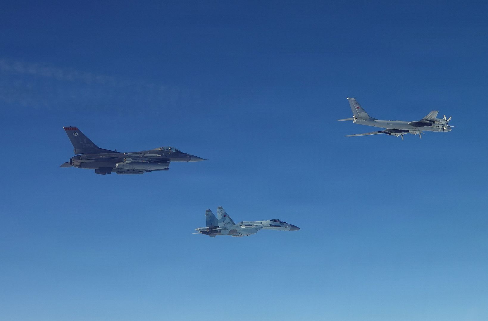 Main AdminNorth American Aerospace Defense Command (NORAD) F-16 Fighting Falcon fighter aircraft positively identified and intercepted Russian Tu-95 and Su-35 military aircraft near the Bering Strait Feb. 19, 2026. NORAD employs a layered defense network of satellites, ground-based and airborne radars and fighter aircraft to detect and track aircraft and inform appropriate actions. NORAD remains ready to employ a number of response options in defense of North America and meeting presence with presence. (U.S. Department of War photos)