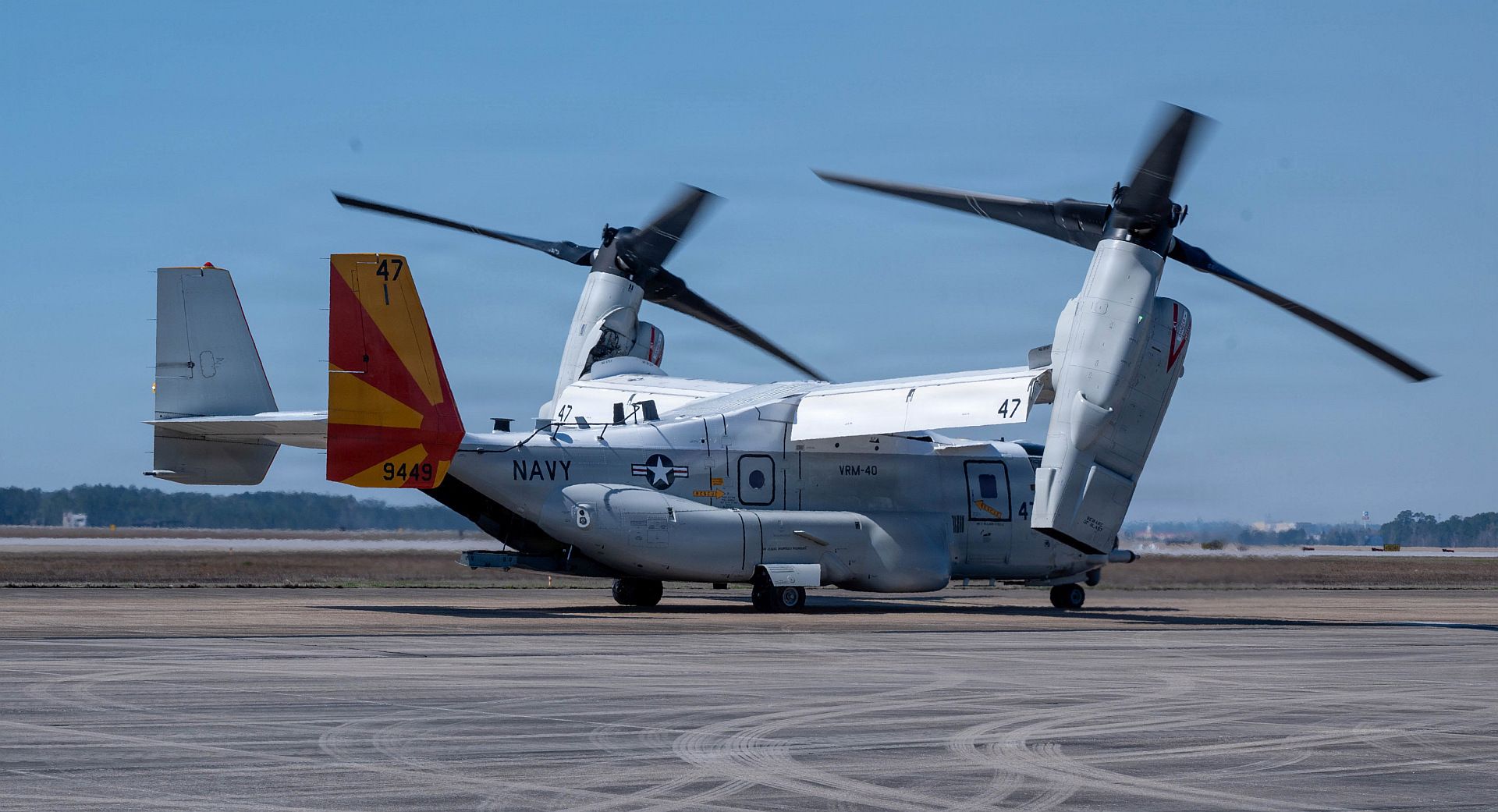 A U.S. Navy V-22 Osprey tiltrotor aircraft, assigned to the Fleet Logistics Multi-Mission Squadron (VRM) 40, taxis during exercise Sentry South 26-2, Gulfport, Mississippi, Feb. 23, 2026. Sentry South 26-2 is a large force employment exercise focused on major combat operations and joint maritime opportunities in a contested or degraded operational environment. Sentry South 26-2 applies joint and combined warfighting doctrine against realistic and robust enemy integrated threat systems, all while under safe and controlled conditions. (U.S. Air National Guard photo by Staff Sgt. Dakota Strait)