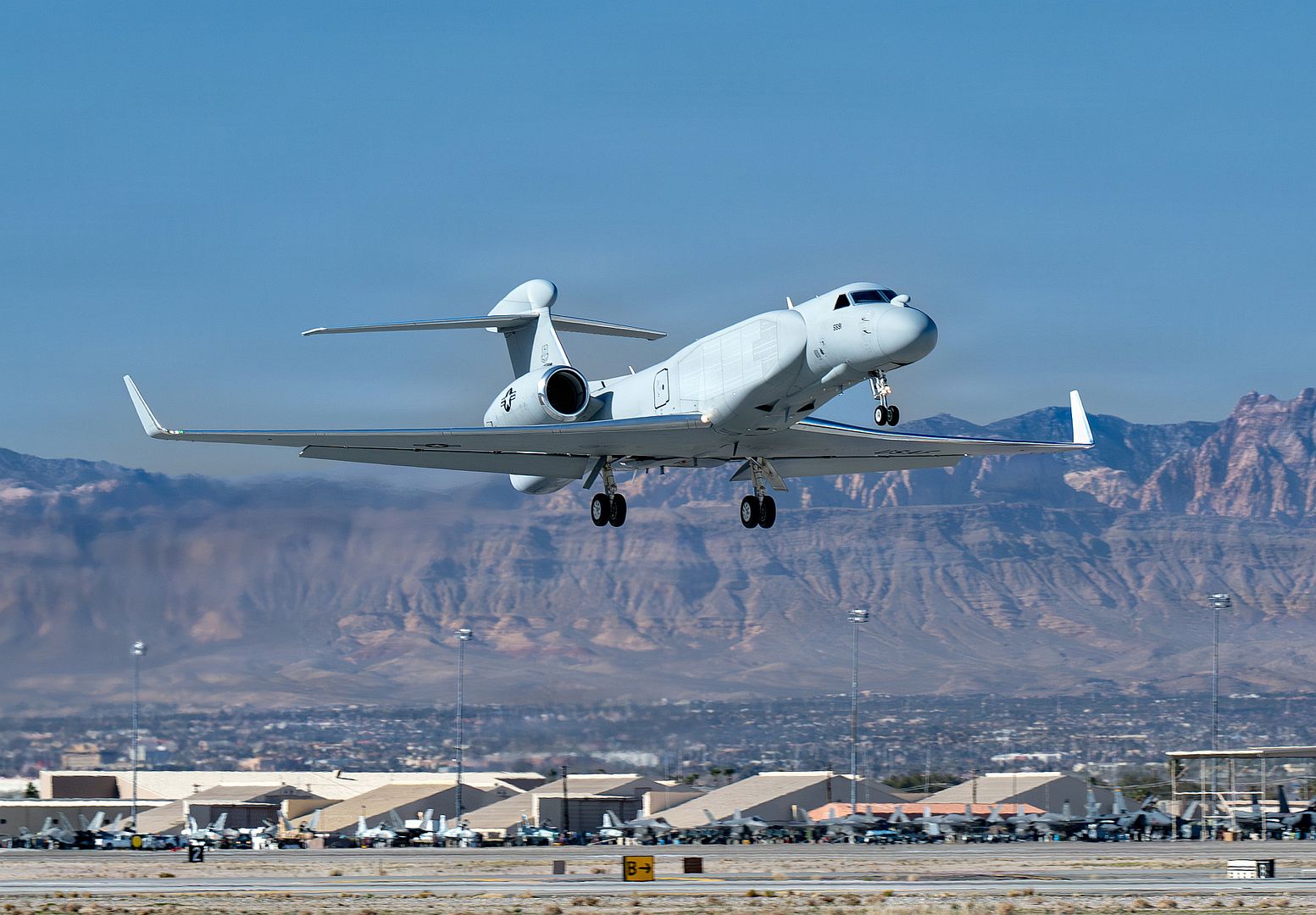 A U.S. Air Force EC-37B Compass Call assigned to the 55th Electronic Combat Group, Davis Monthan Air Force Base, Arizona, takes off from Nellis AFB, Nevada, in support of Red Flag-Nellis 26-1, Jan. 29, 2026. Red Flag-Nellis 26-1 utilizes the Nevada Test and Training Range, the U.S. Air Force's premier military training area with more than 12,000 square miles of airspace and 2.9 million acres of land. (U.S. Air Force photo by William R. Lewis)