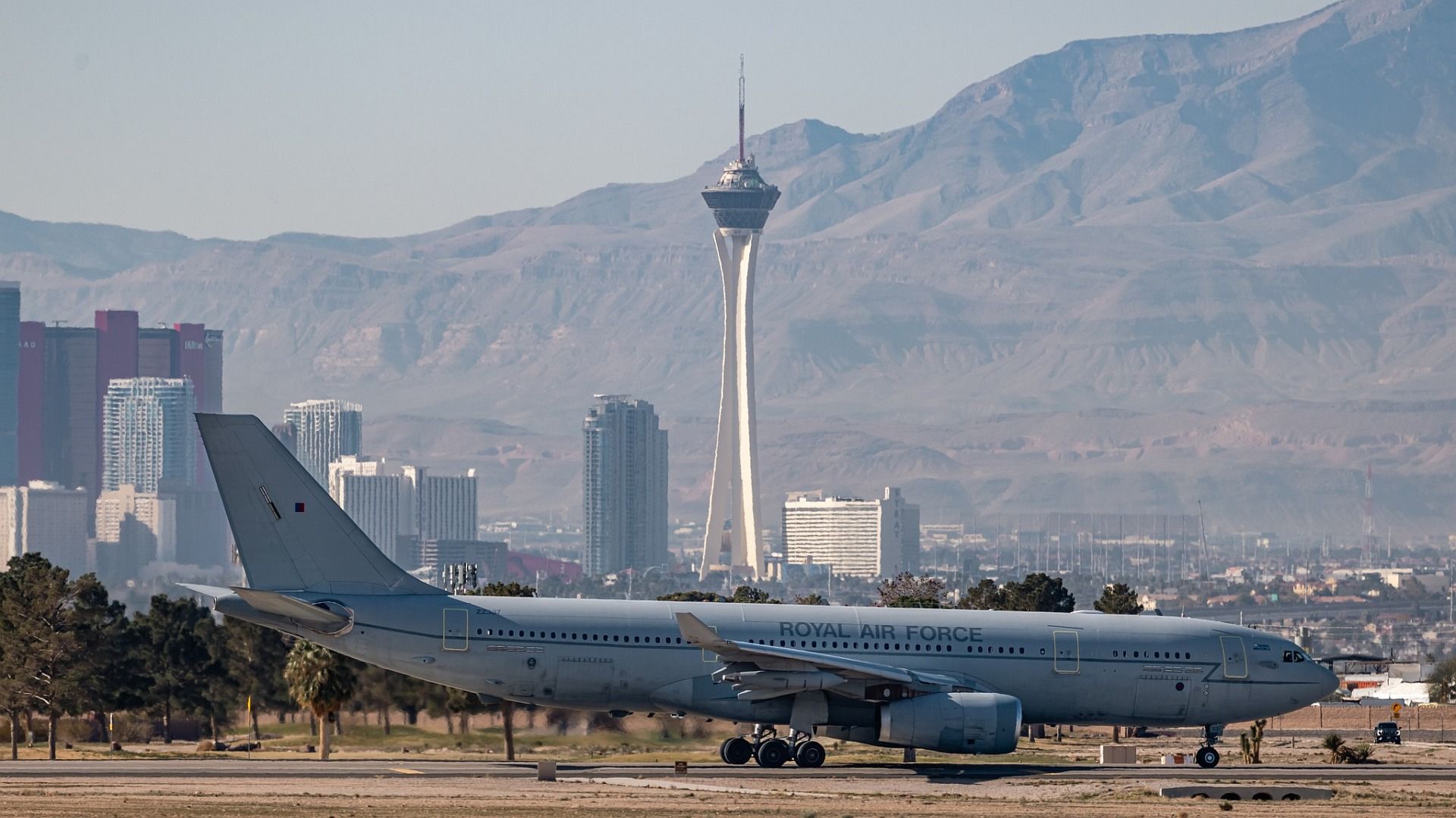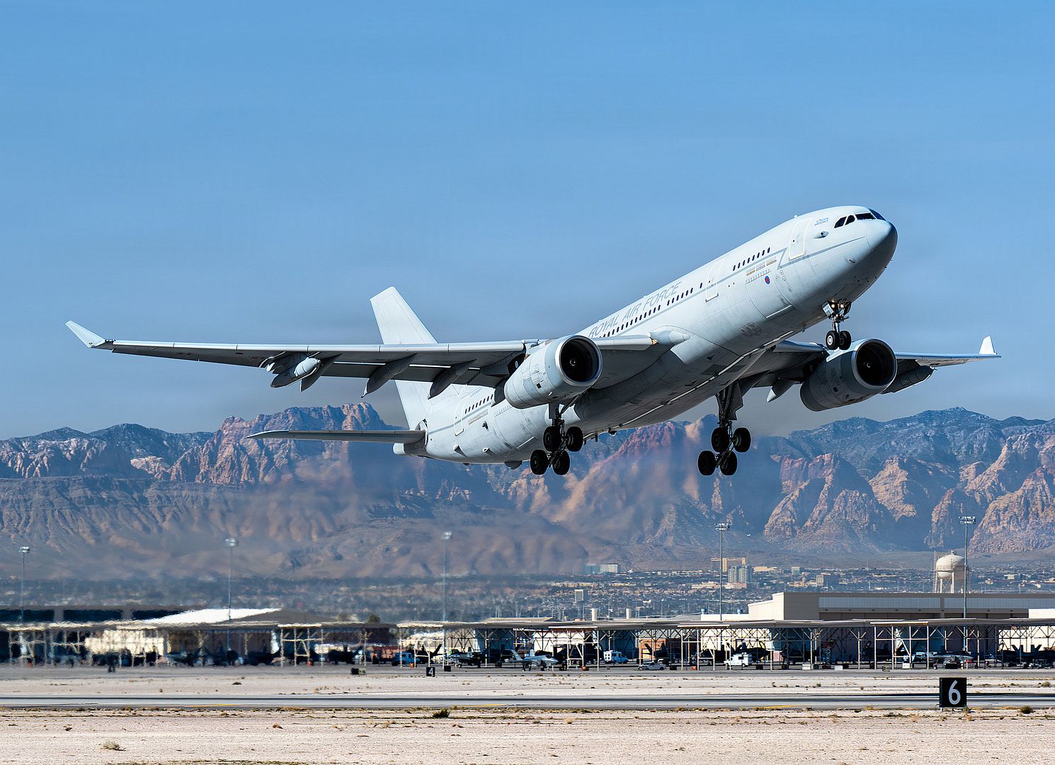 A British Royal Air Force A330 Voyager tanker takes off from Nellis Air Force Base, Nevada, in support of Red Flag-Nellis 26-1, Jan. 29, 2026. Red Flag increases interoperability between partner nations and across the Joint Forces as Airman and Guardians train together in high-end, realistic scenarios. (U.S. Air Force photo by William R. Lewis)