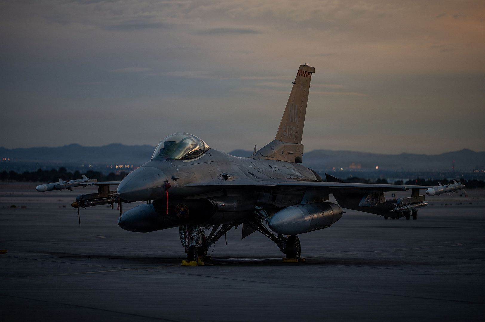A U.S. Air Force F-16C Fighting Falcon, assigned to the 64th Aggressor Squadron, sits on the flightline after recovery maintenance in support of Red Flag-Nellis 26-1 at Nellis Air Force Base, Nevada, Feb. 5, 2026. Through combined training, the U.S. and Allied forces work together to promote interoperability, furthering mutual interests and strengthening relationships. (U.S. Air Force photo by Airman 1st Class Heather Amador Paulino)