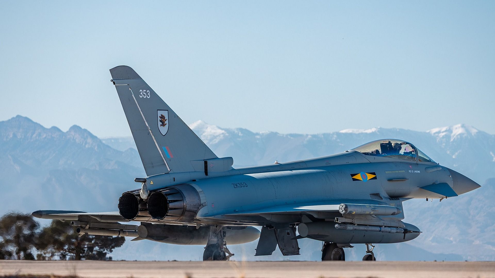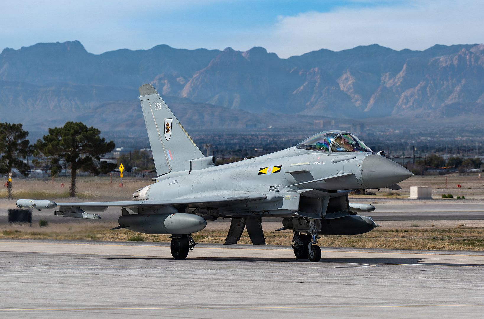 A Eurofighter Typhoon FGR4 assigned to the Royal Air Force taxis following a mission at Nellis Air Force Base, Nevada, Jan. 26, 2026. The Typhoons are deployed to Nellis AFB to participate in Exercise Red Flag 26-1, a multinational large-force exercise designed to enhance coalition readiness and interoperability. (U.S. Air Force photo by William R. Lewis)