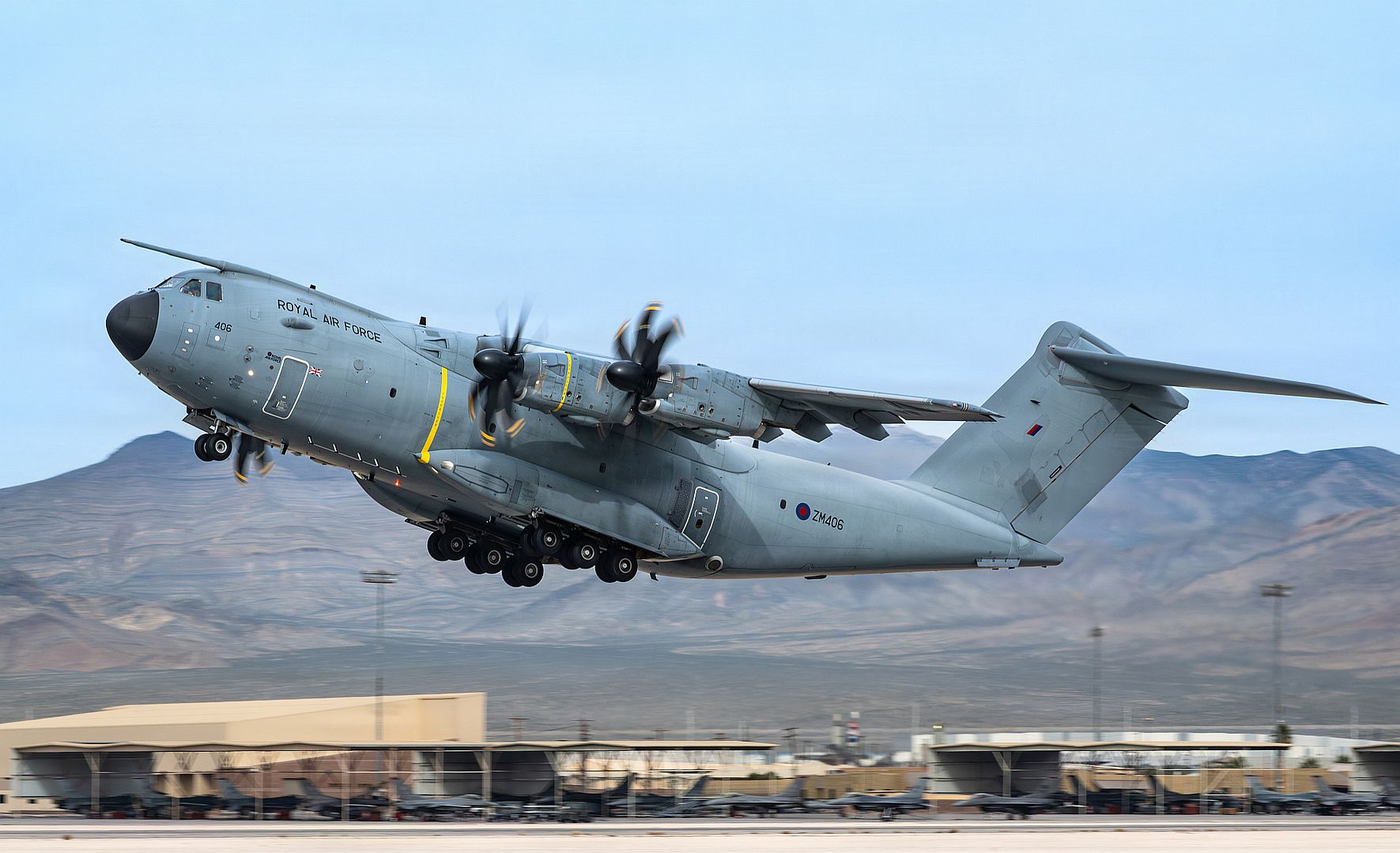 A British Royal Air Force Airbus A400M Atlas takes off from Nellis Air Force Base, Nevada, Jan. 21, 2026. The aircraft transported personnel and cargo in support of Exercise Red Flag-Nellis 26-1. (U.S. Air Force photo by William R. Lewis)