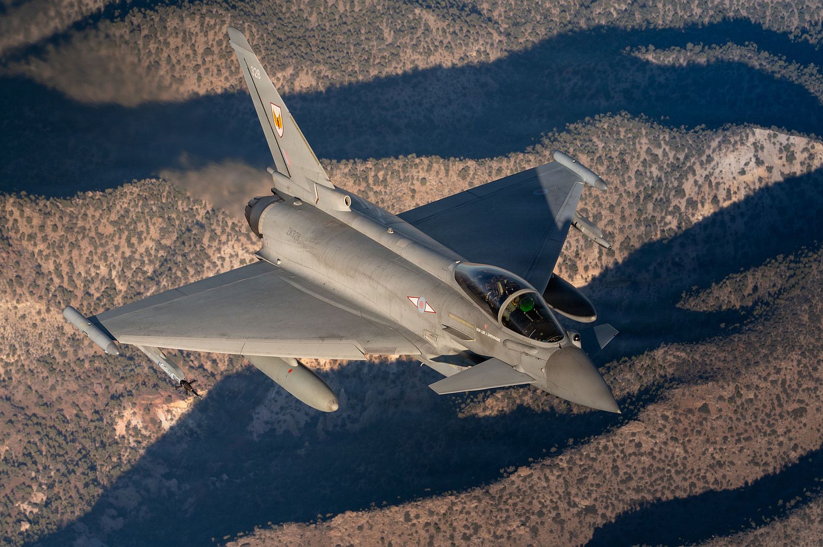 A British Royal Air Force Eurofighter Typhoon flies during Red Flag-Nellis 26-1 over Nevada, Feb. 6, 2026. Red Flag increases interoperability between Allied nations and across the joint force as service members train together in high-end, realistic scenarios. (U.S. Air Force photo by Airman 1st Class Heather Amador Paulino)