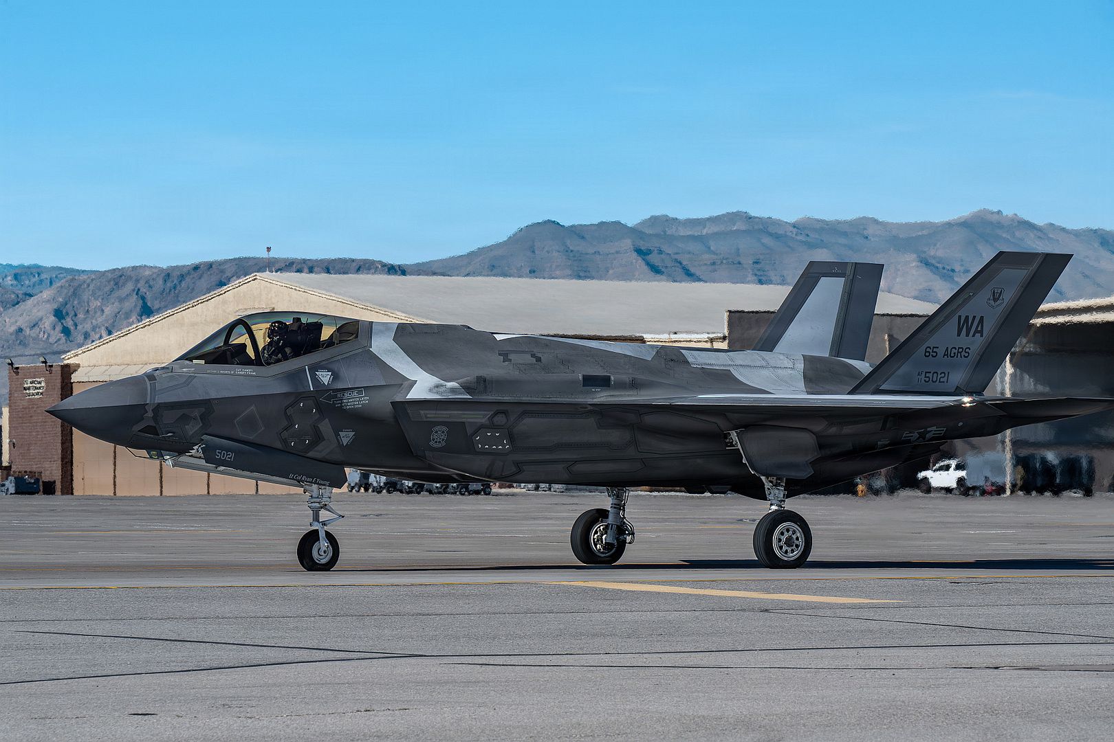 An F-35A Lightning II, assigned to the 65th Aggressor Squadron, taxis out for a mission during Red Flag-Nellis 26-1, at Nellis Air Force Base, Nevada, Feb. 4, 2026. The 65th Aggressor Squadron replicates advanced and credible adversary tactics to provide Allied and joint force pilots the opportunity to train in high-end, realistic scenarios. (U.S. Air Force photo by William R. Lewis)