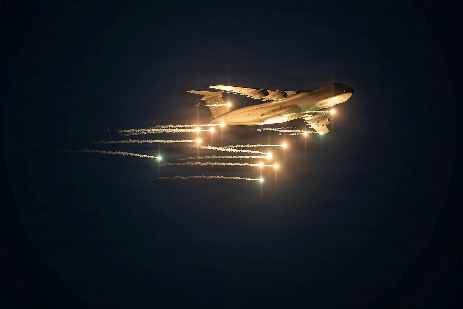A C-5M Super Galaxy conducts flare testing operations at Eglin Air Force Base, Florida, Feb. 13, 2026. Team Eglin units coordinated flare-testing operations to evaluate and field improved defensive-system capabilities for Air Mobility Command aircraft. (U.S. Air Force photo by Master Sgt. J.D. Strong II)