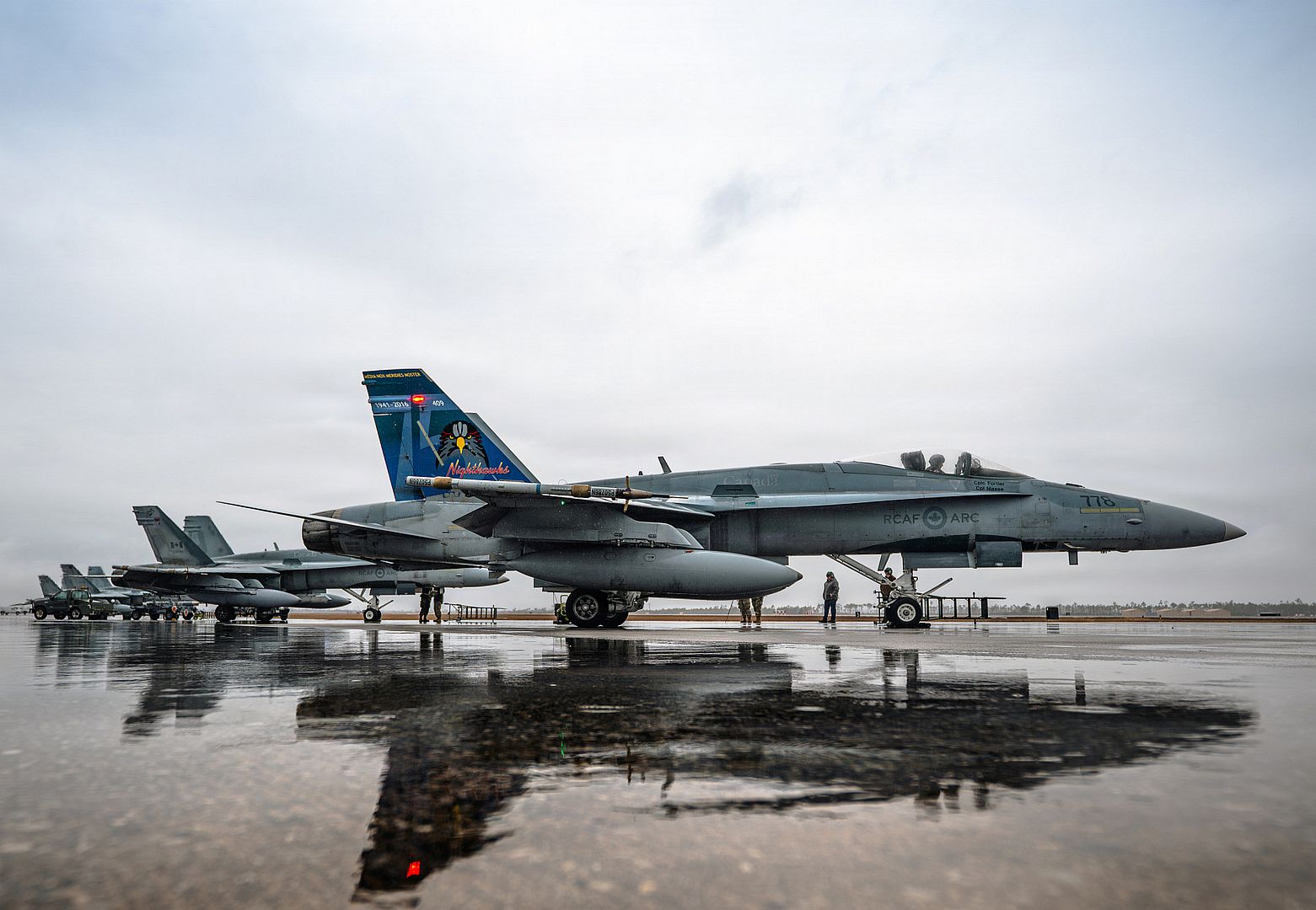 Royal Canadian Air Force personnel inspect a CF-18A Hornet assigned to the 425th Tactical Fighter Squadron, Canadian Forces Base Bagotville, Quebec, during Weapons System Evaluation Program-East 26.02 at Tyndall Air Force Base, Florida, Feb. 4, 2026. WSEP provides a unique training experience for both U.S. and Allied forces that benefits a multitude of mission sets. Additionally, WSEP is one of the only military exercises that provides the opportunity for aircraft to practice with live fire scenarios. (U.S. Air Force photo by Senior Airman Zeeshan Naeem)