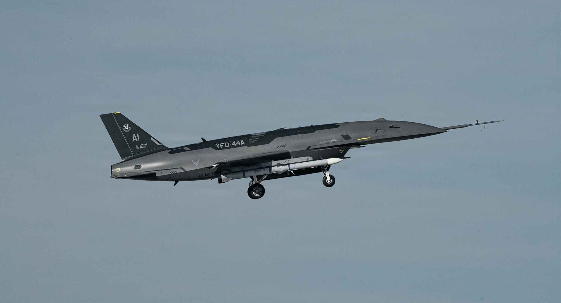 A YFQ-44A, part of the Air Force’s Collaborative Combat Aircraft (CCA) program, undergoes an undated captive carry test at a California test location. This test phase uses inert munitions to methodically validate weapons integration, structural performance and safety, ensuring the platform can safely carry external stores. The CCA program is a critical part of a larger, integrated system-of-systems designed to extend the reach and effectiveness of crewed aircraft, giving U.S. warfighters an overwhelming advantage in future conflicts. (Courtesy photo)