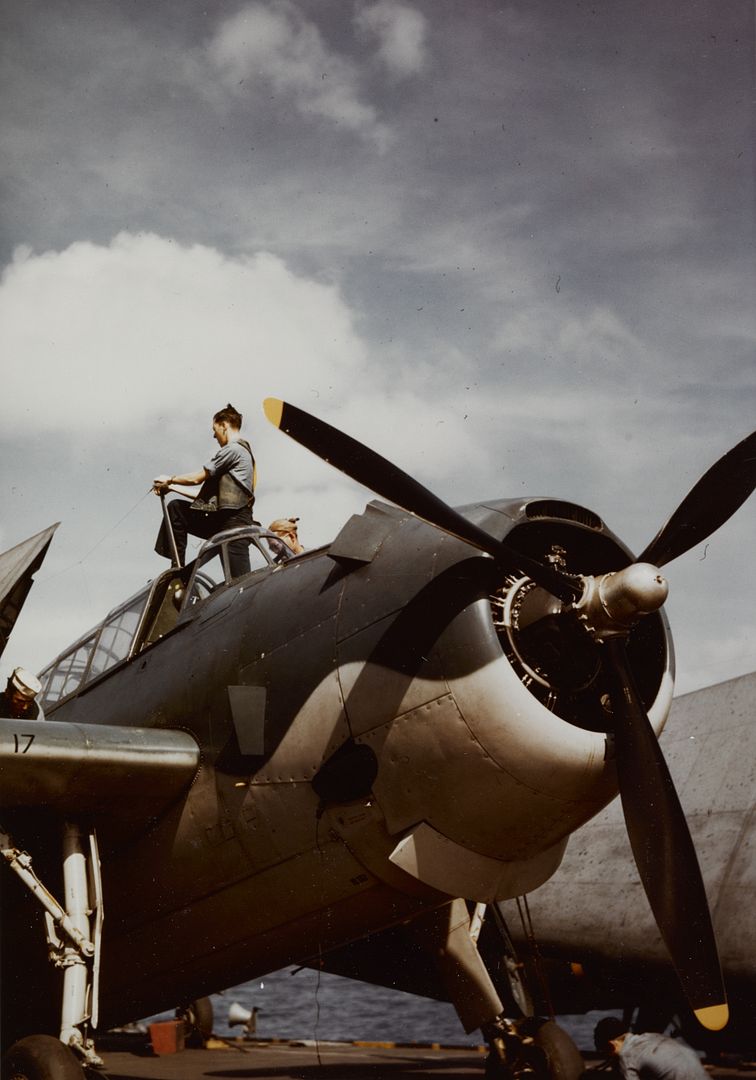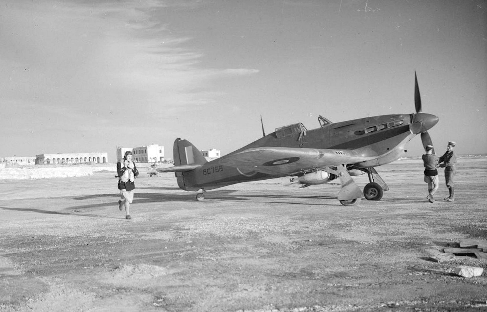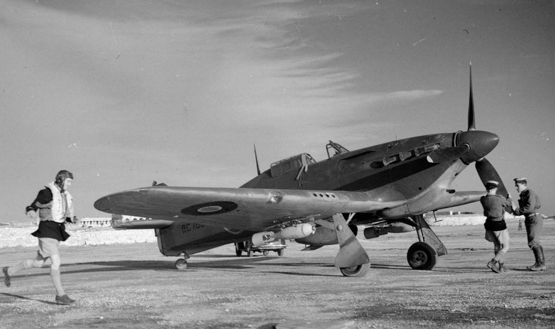 An FAA pilot runs to his Hurricane IIb,armed with two 250lb bombs (on bomb racks acquired from Beaufighters) seen at Hal Far, Malta early 43.The aircraft were transferred from RAF to Admiralty charge, and were flown by Albacore and Swordfish units,also with survivors of the Fulmar intruder flight.Repainted in extra dark sea grey on the upper surfaces,with azure blue, or sky blue under surfaces,the aircraft undertook intruder operations and ASR patrols.