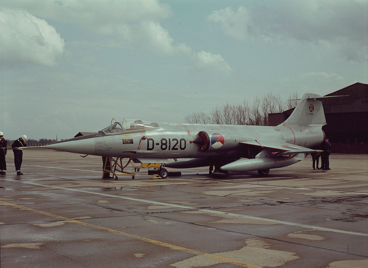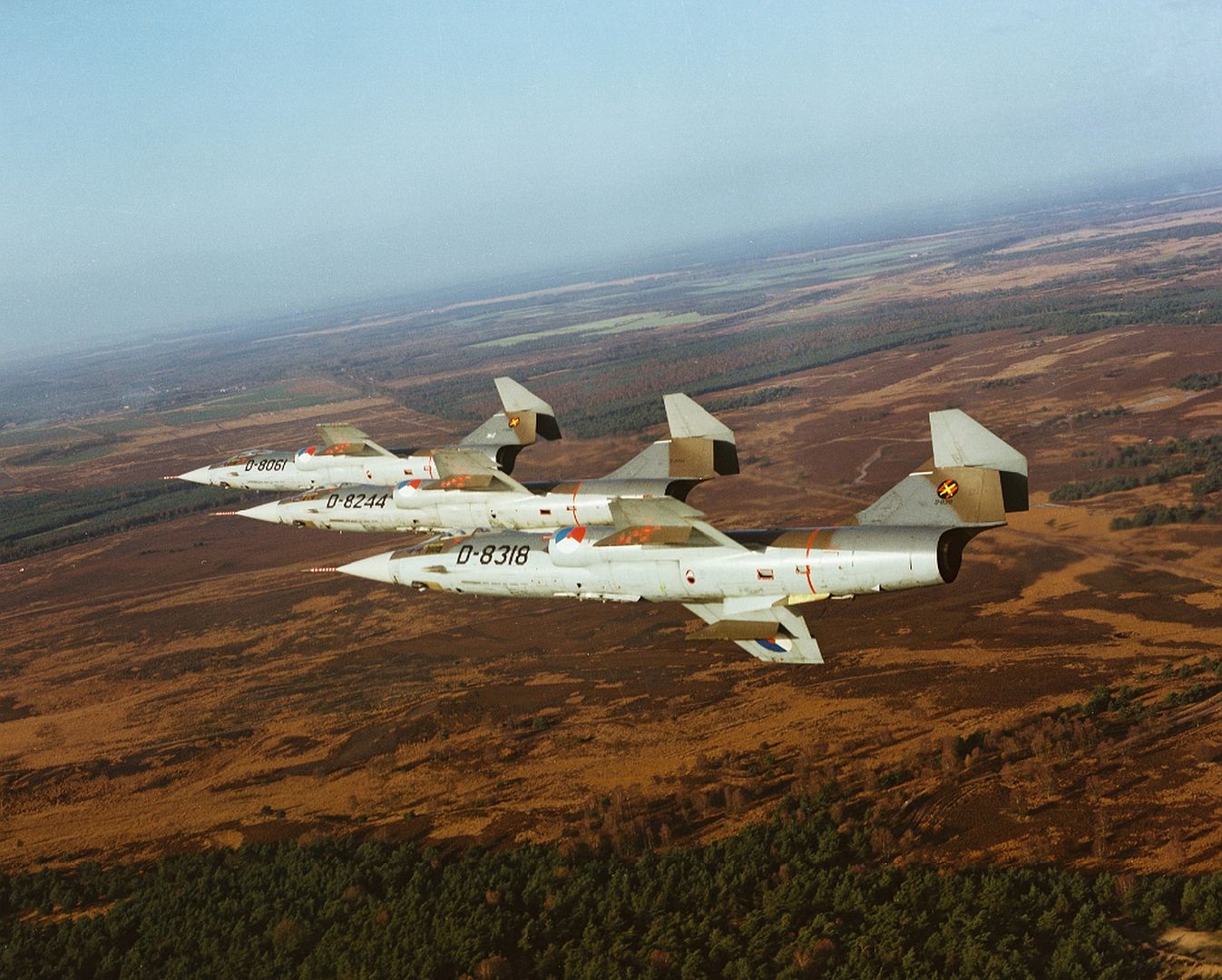 The Netherlands was another major European Starfighter user, with the type going into service to replace the F-84 / RF-84, as well as Lockheed RT-33s. The Dutch acquired 95 F-104Gs, 25 RF-104Gs, and 18 TF-104Gs from Fokker, Fiat, and Lockheed production. That gave a total of 120 single-seaters and 18 two-seaters, or 135 aircraft in all. Dutch RF-104Gs did not have the trimetrogon camera system, instead being fitted with the NVOI Orpheus centerline reconnaissance pod, with five TA-8M film cameras and an infrared linescan unit.