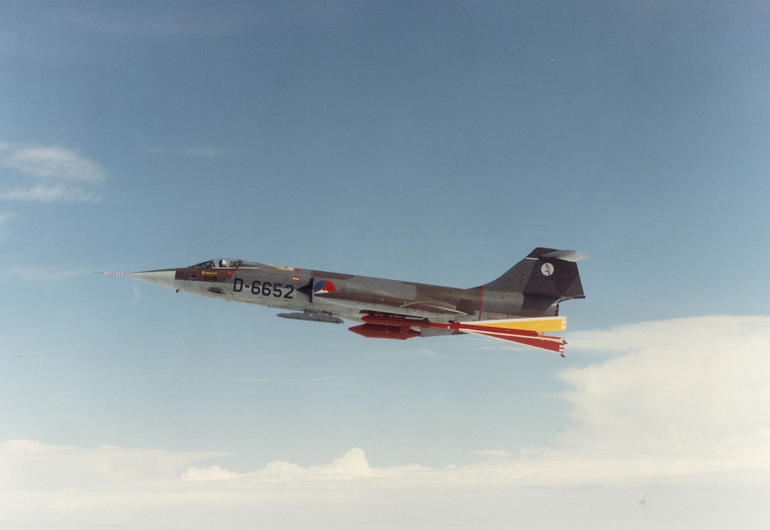 Dutch Starfighters were delivered in overall anti-corrosion gray colors, but were given the standard NATO camouflage of a dark gray / dark green disruptive pattern on top and medium gray underneath. These machines served into the mid-1980s, being ultimately replaced by the F-16. Some of the survivors were passed on to Greece and Turkey. The Dutch lost a total of 43 Starfighters from accidents, a painful attrition rate of 35.8%.