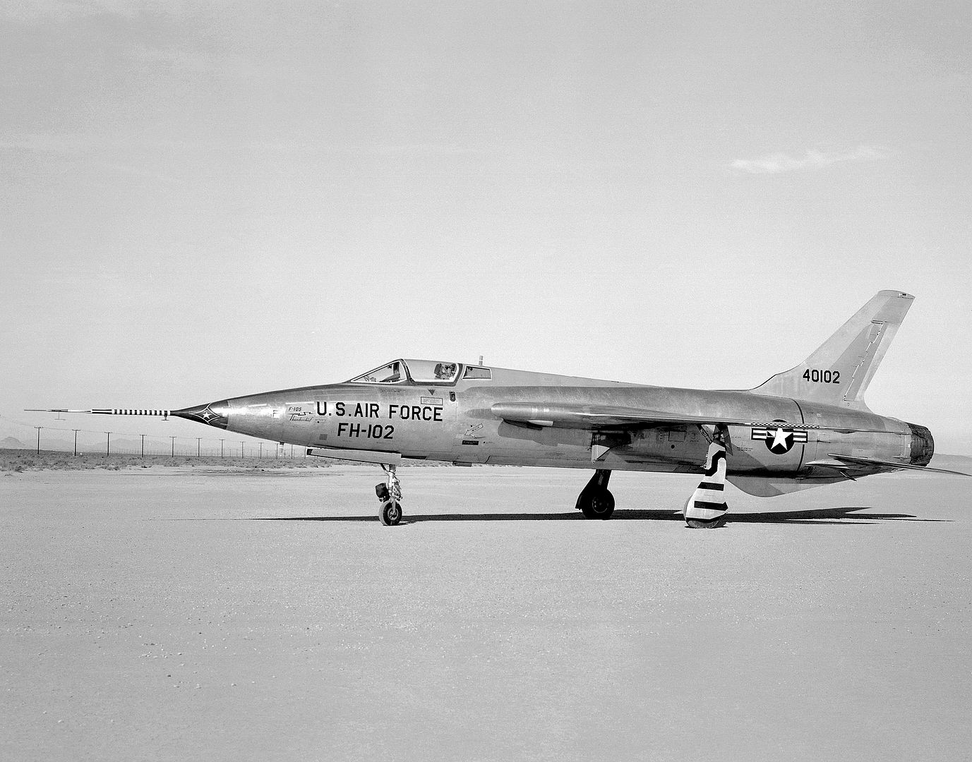 On January 30, 1957, the next YF-105B (54-101) took off on its first flight. It too ended up on its belly after yet another landing gear failure. The problem was traced to an interference between the main landing gear and auxiliary air intakes, and was fairly easily fixed.