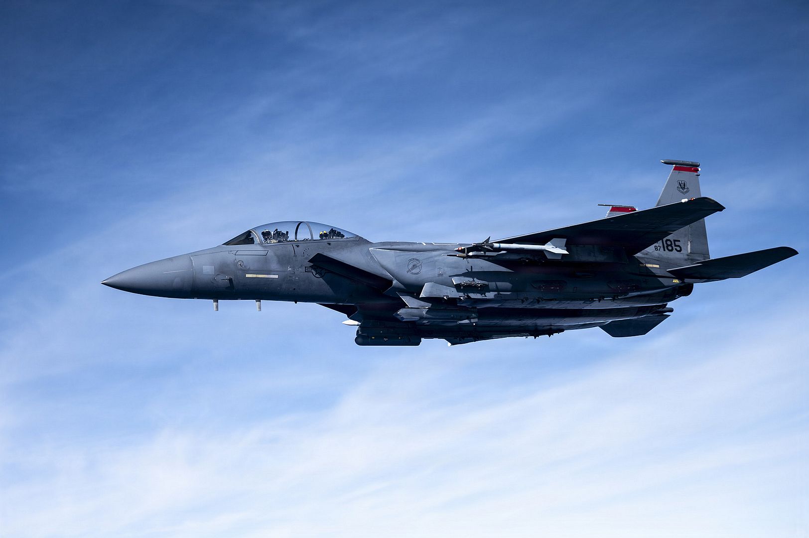F-15E Strike Eagles with the 4th Fighter Wing approach a KC-135 Stratotanker from the 121st Air Refueling Wing to be refueled over the skies of North Carolina, Jan 22, 2026. The F-15E is a versatile fighter jet built to handle both air-to-air and air-to-ground missions, equipped with advanced avionics and electronics that enable it to operate effectively at low altitudes, day or night, and in any weather. (U.S. Air National Guard photos by Airman Samir Harris)