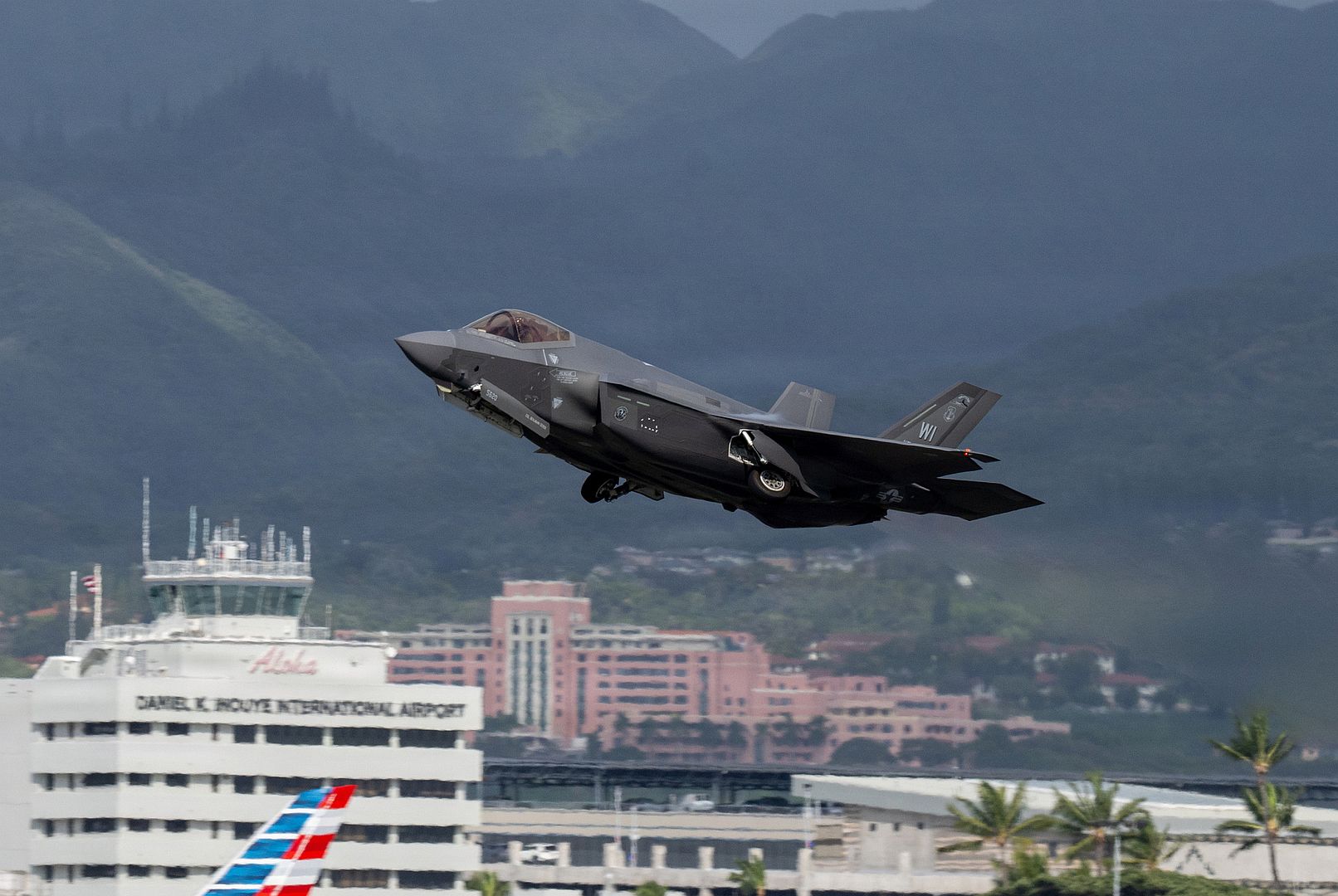 A U.S. Air Force F-35 Lighting II, assigned to the Wisconsin Air National Guard 115th Fighter Wing, takes off from Daniel K. Inouye International Airport, Hawaii, Jan. 14, 2026, during Sentry Aloha 26-1. The F-35 Lightning II is the U.S. Air Force’s latest fifth generation fighter. (U.S. Air Force photo by Senior Airman Aden Brown)