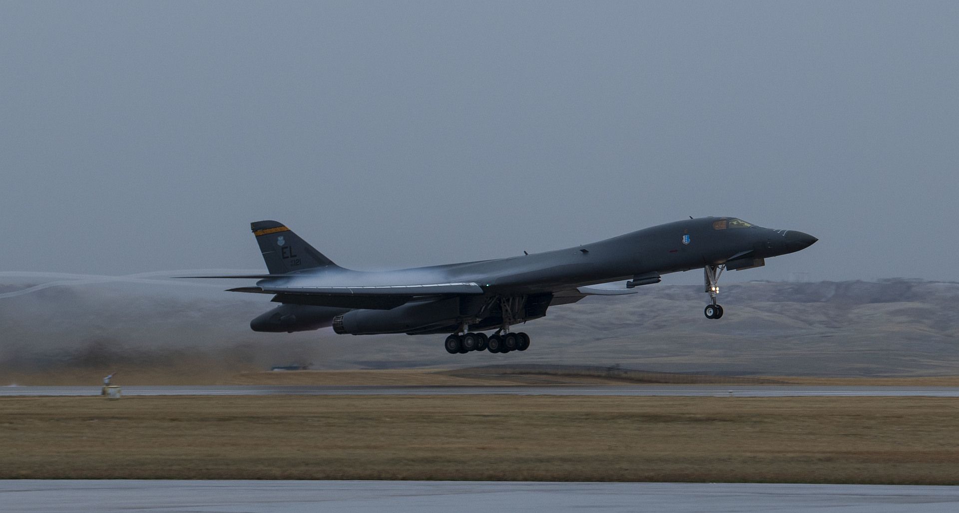 A B-1B Lancer takes off in support of a Bomber Task Force mission at Ellsworth Air Force Base, S.D., April 6, 2021. Bomber Task Force missions allow the U.S., to routinely and visibly demonstrate commitment to our Allies and partners through the global employment of our military. (U.S. Air Force photo by Senior Airman Christina Bennett)