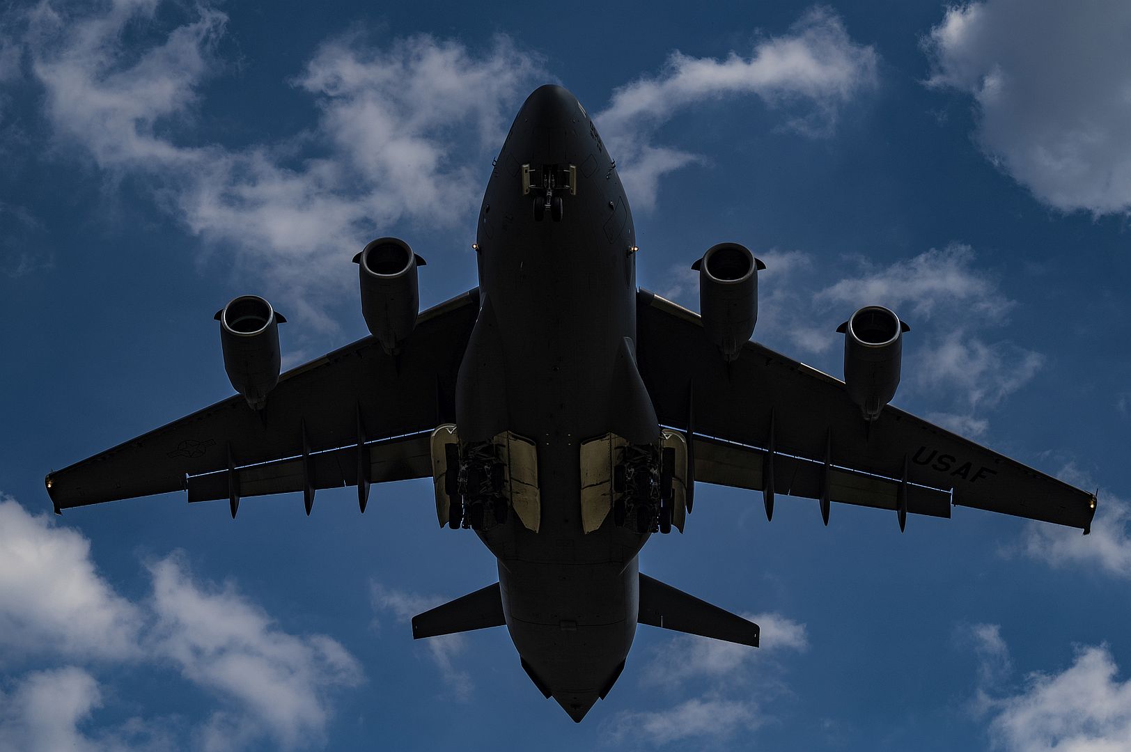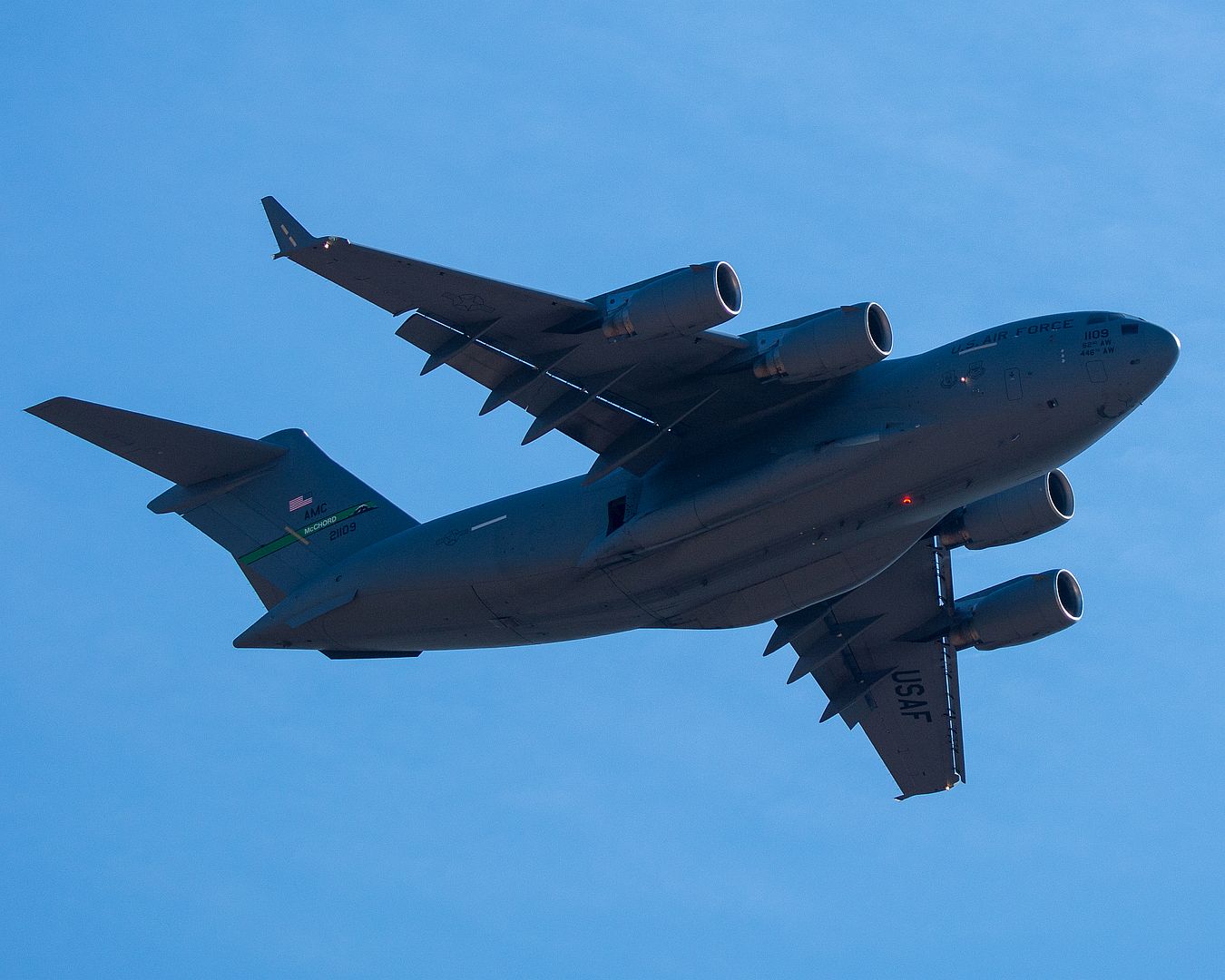 A C-17 Globemaster III assigned to the 911th Airlift Wing prepares to land while conducting touch-and-go flight training at the Pittsburgh International Airport Air Reserve Station, Pennsylvania, April 6, 2021. Touch-and-go training allows pilots to practice emergency landing and take-off procedures for situations they may encounter while flying a real-world mission. (U.S. Air Force photo by Joshua J. Seybert)