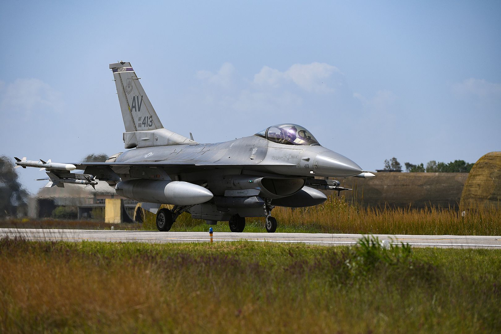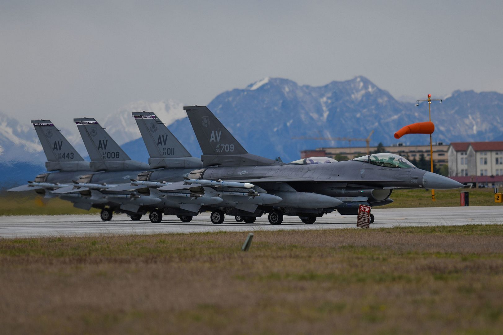 Four U.S. Air Force F-16 Fighting Falcons assigned to the 510th Fighter Squadron prepare to take off to support exercise INIOCHOS 21, Aviano Air Base, Italy, April 6, 2021. INIOCHOS is an annual exercise in Greece that provides participants the opportunity to develop capabilities in planning and conducting complex air operations in a multinational joint forces environment. The exercise provides advanced and realistic aircrew training to strengthen interoperability of allied and partner air forces. (U.S. Air Force photo by Senior Airman Ericka A. Woolever)