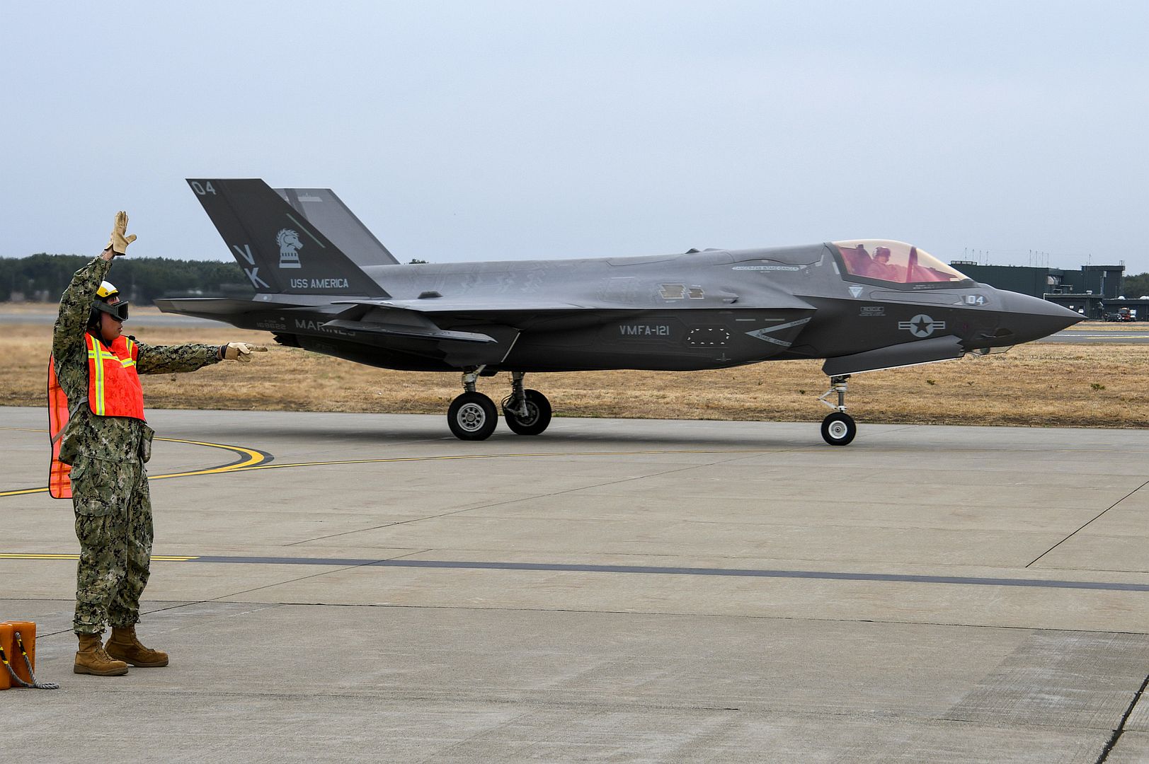 MISAWA, Japan (April 13, 2021) Aviation Boatswain's Mate (Handling) 3rd Class Niko Andre Manuel, assigned to Naval Air Facility (NAF) Misawa, directs an F-35B Lightning II, assigned to the "Green Knights" of Marine Fighter Attack Squadron (VMFA) 121, at NAF Misawa. NAF Misawa provides aviation and ground logistics support and services to all permanent and transient U.S. Navy and U.S. Marine Corps forces in Northern Japan. VMFA-121 is the first operational F-35 squadron in the U.S. military. (U.S. Navy photo by Mass Communication Specialist Seaman Benjamin Ringers)