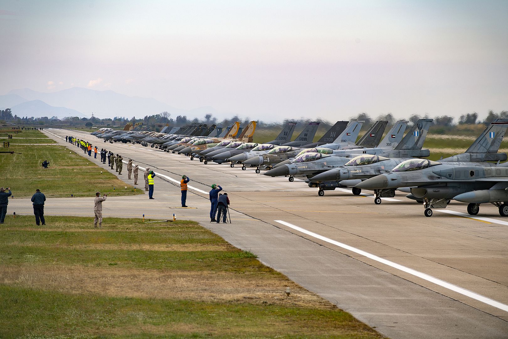 Aircraft from several countries participating in INIOCHOS 21 line up prior to an elephant walk at Andravida Air Base, Greece, April 18, 2021. Elephant walks are a show of force, demonstrating the might and power of the U.S. Air Force and its allies. The 510th Fighter Squadron participated in INIOCHOS 21, a Hellenic air force-led exercise designed to enhance the interoperability and skills of allied and partner air forces in the accomplishment of joint operations and air defenses. (U.S. Air Force photo by Airman 1st Class Thomas S. Keisler IV)
