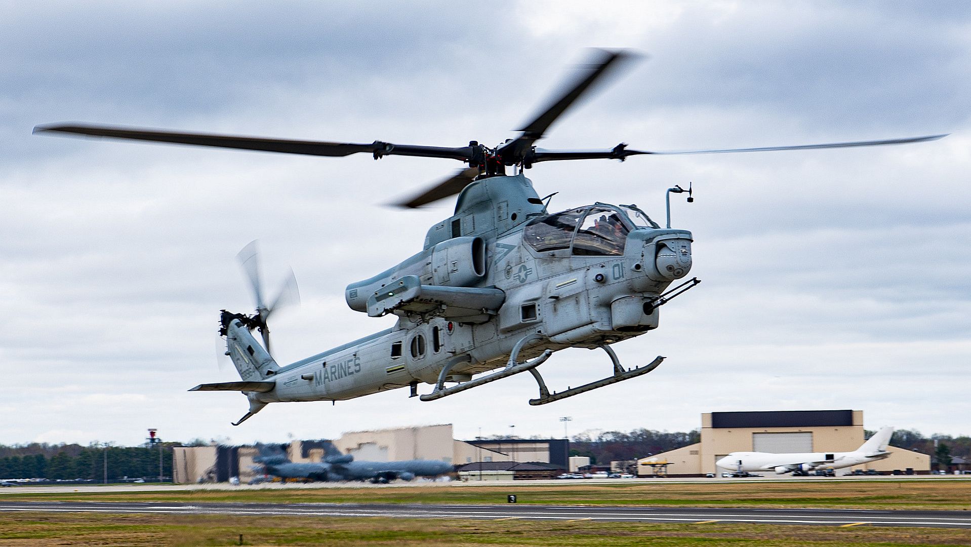 BAY OF BENGAL (April 5, 2021) – A U.S. Marine Corps AH-1Z assigned to Marine Medium Tiltrotor Squadron 164 (Reinforced), 15th Marine Expeditionary Unit, takes off from the flight deck of the amphibious transport dock ship USS Somerset (LPD 25) during La Perouse 2021. USS Somerset is part of the Makin Island Amphibious Ready Group with embarked 15th MEU operating in the U.S. 7th Fleet area of responsibility. La Perouse is an exercise during the annual French Navy midshipman deployment called Mission Jeanne d'Arc. The exercise is designed to conduct training, enhance cooperation in maritime surveillance, maritime interdiction operations, and air operations. (U.S. Marine Corps photo by Lance Cpl. Brendan Mullin)
