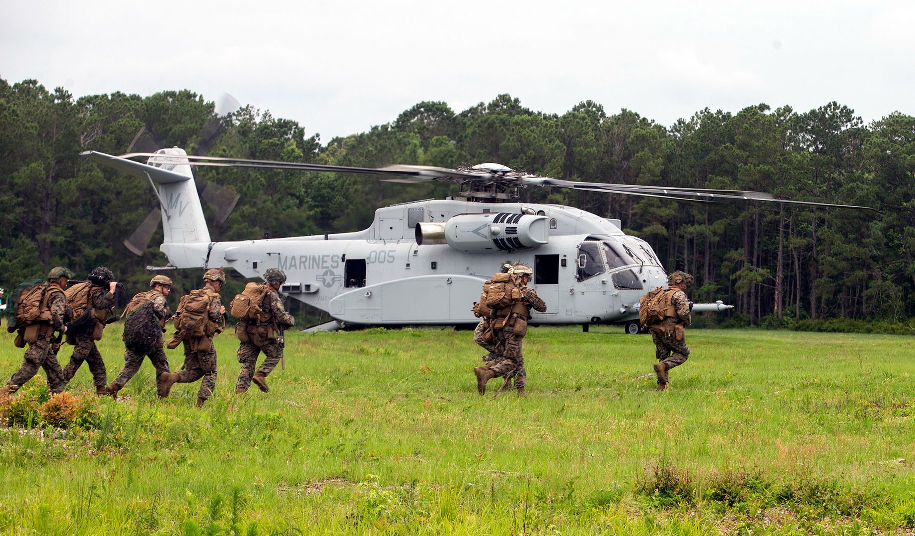 A U.S. Marine with Marine Heavy Helicopter Squadron (HMH) 461 inspects a CH-53K King Stallion prior to its first operational flight at Marine Corps Air Station New River, North Carolina, April 13, 2022. The flight signified the beginning of HMH-461's modernization from the CH-53E Super Stallion to the CH-53K King Stallion. HMH-461 is a subordinate unit of 2nd Marine Aircraft Wing, the aviation combat element of II Marine Expeditionary Force. (U.S. Marine Corps photos by Lance Cpl. Elias E. Pimentel III)