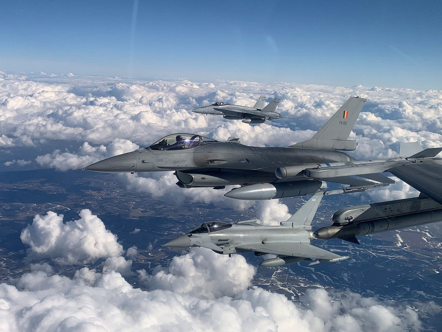 A U.S. Air Force F-16 from the 480th Expeditionary Fighter Squadron flies in formation alongside a Romanian air force F-16 Fighting Falcon, an Italian Air Force Typhoon and a Royal Air Force Typhoon over the RAF NATO certification ceremony April 8, 2022, at Mihail Kogalniceanu (MK) Air Base, Romania. Allied Air Forces stand shoulder-to-shoulder to provide a robust collective defense and deliver constant vigilance across NATO airspace. (U.S. Air Force photo by Tech. Sgt. Maeson L. Elleman)
