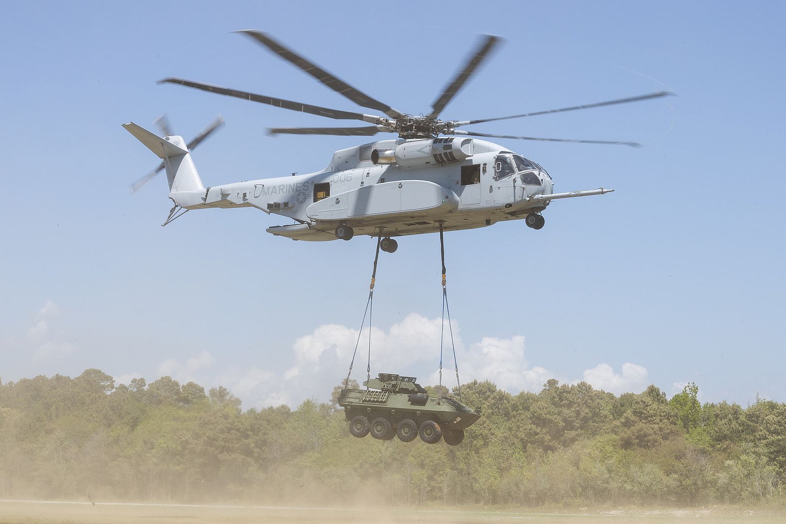 Main AdminU.S. Marines with Marine Operational Test and Evaluation Squadron (VMX) 1 transport a Light Armored Vehicle 25 with a CH-53K King Stallion helicopter at Marine Corps Base Camp Lejeune, North Carolina, April 27, 2022. The CH-53K King Stallion, the Marine Corps’ newest heavy-lift helicopter, can lift up to 36,000 pounds of equipment, holds up to 30 troops, and features a computerized fly-by-wire system for semiautonomous piloting. (U.S. Marine Corps photo by Lance Cpl. Elias E. Pimentel III)