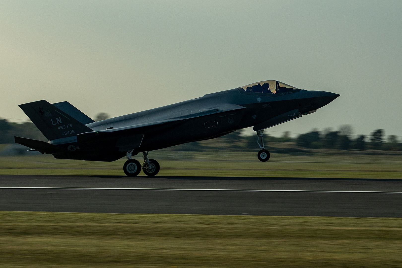 A U.S. Air Force F-35A Lightning II assigned to the 495th Fighter Squadron lands at Royal Air Force Lakenheath, England, April 16, 2022. These new aircraft aid in providing the Liberty Wing with a combination of low observability and multi-mission capability. (U.S. Air Force photo by Staff Sgt. Dhruv Gopinath)