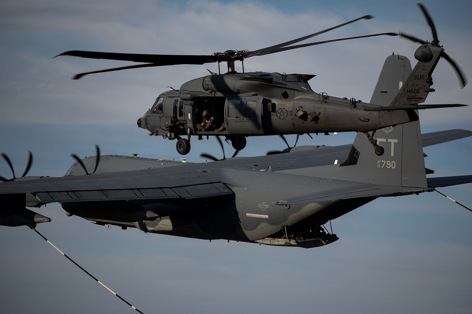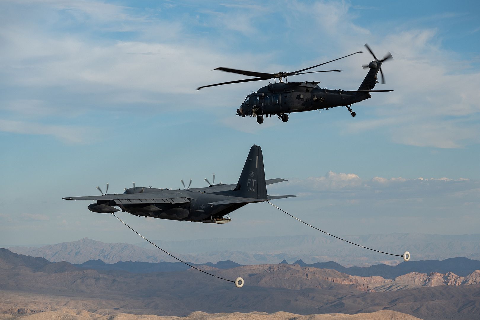 Main AdminA U.S. Air Force HH-60W Jolly Green II and HC-130J Combat King assigned to the 34th Weapons School perform a flyover over Las Vegas, Nevada, Oct. 9, 2023. The HH-60W Jolly Green II replaced the HH-60G Pave Hawk as a dedicated Combat Rescue Helicopter. (U.S. Air Force photos by Senior Airman Josey Blades)