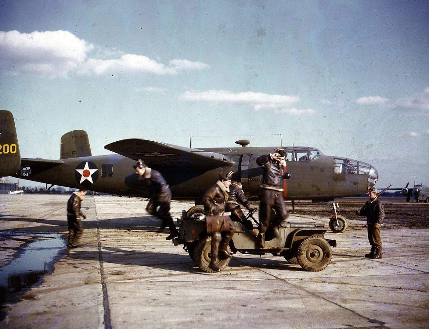 Ground crews warm up the engines of a North American B-25A Mitchell bomber before takeoff from an airfield on the US East Coast,as the flight crew jump from a Jeep during an "emergency" call at an East coast airfield.