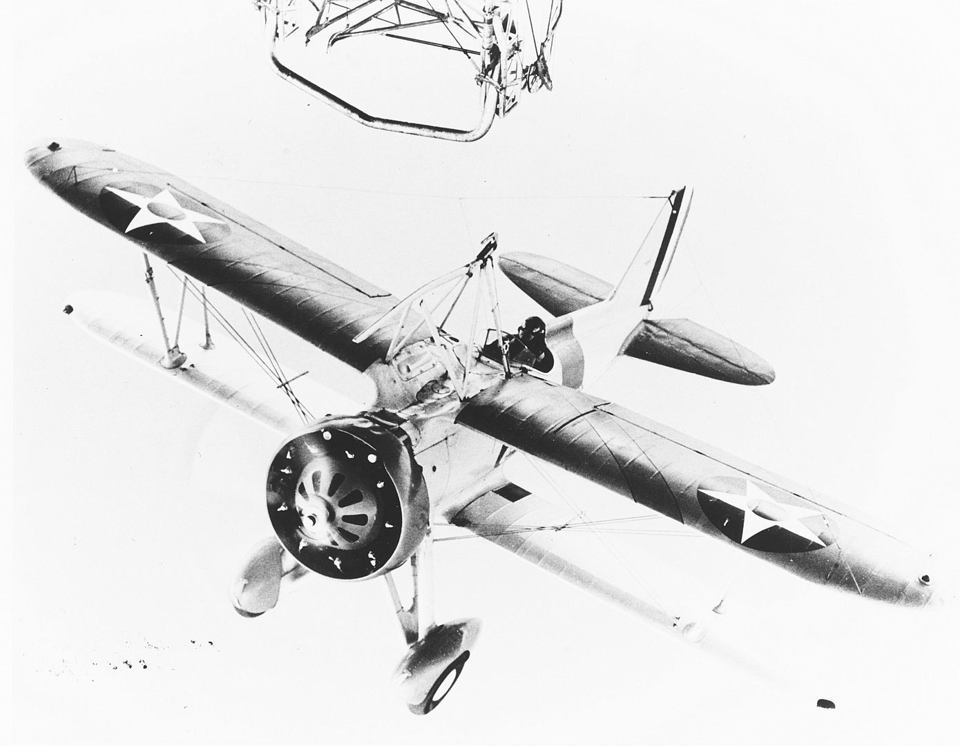 In 1934, two two-seat Waco UBF XJW-1 biplanes equipped with skyhooks were delivered to USS Macon.