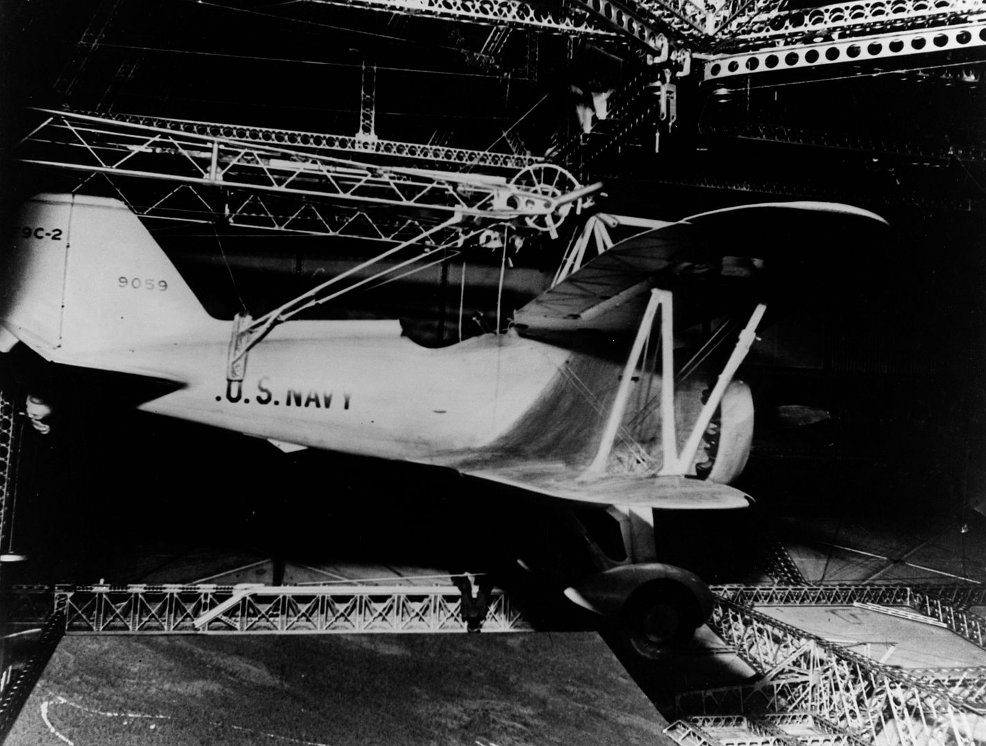 Curtiss F9C-2 Sparrowhawk fighter Bureau 9059 Inside the airplane hangar of USS Akron ZRS-4 1932.