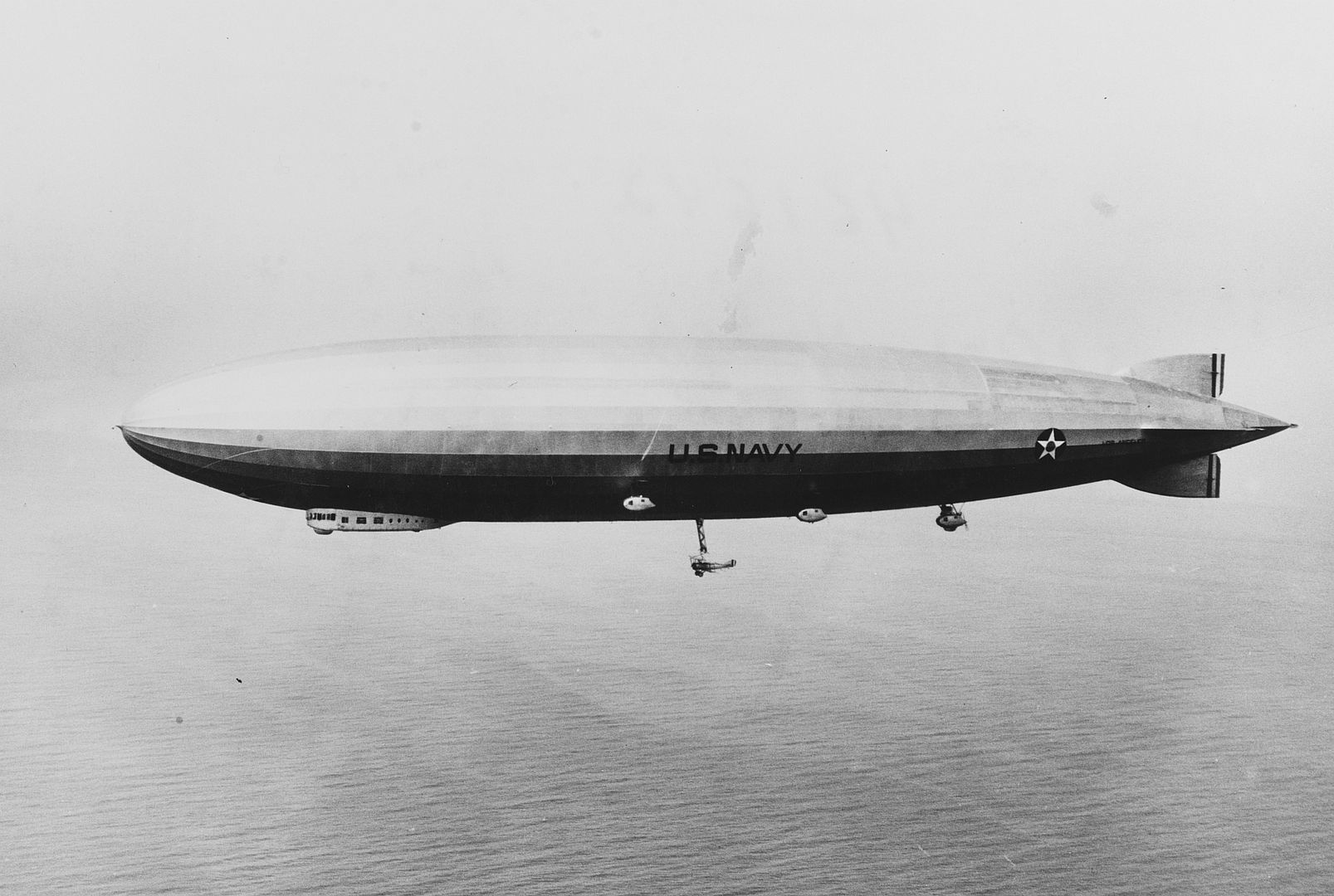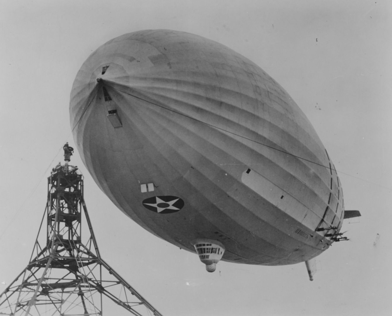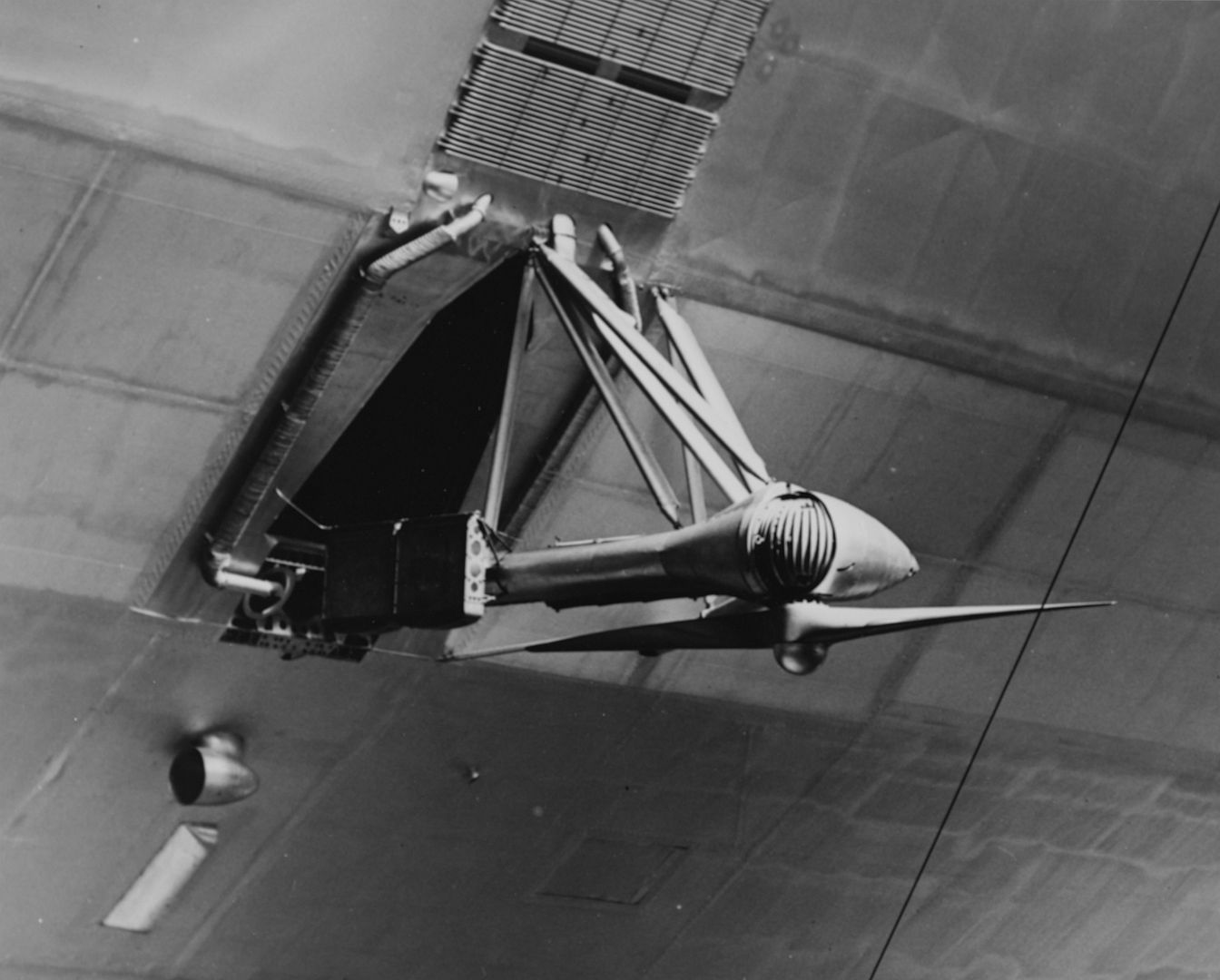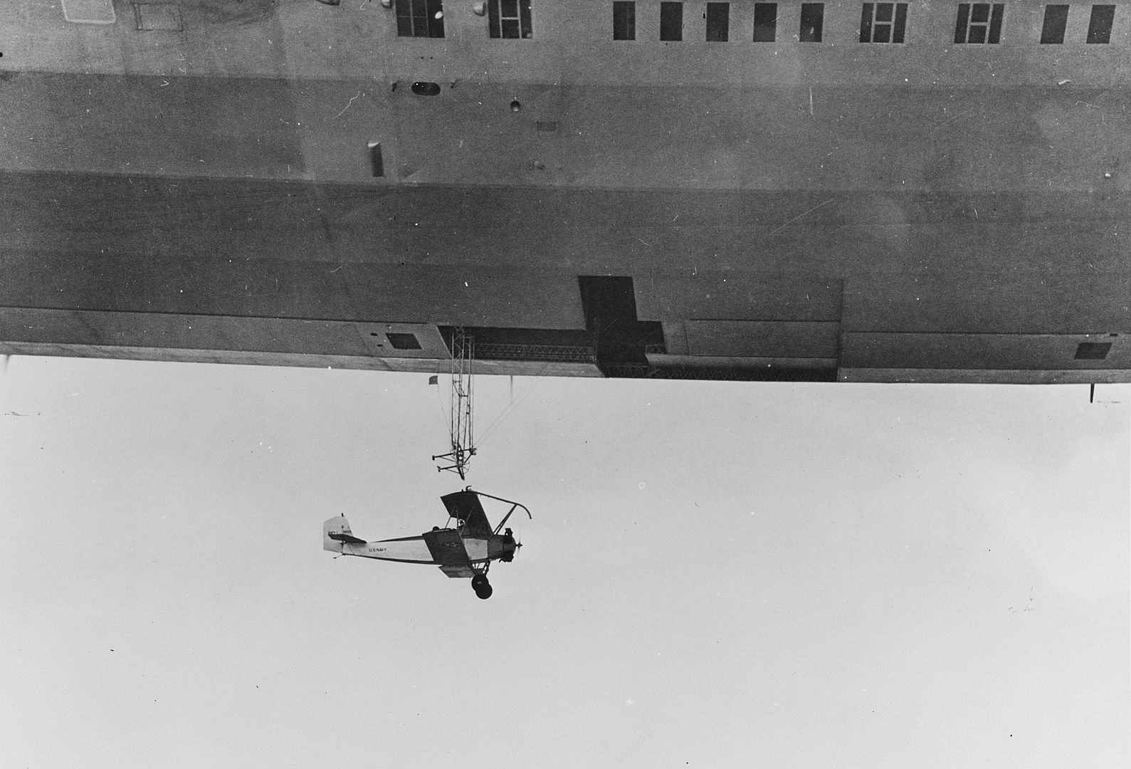 On 20 August 1929, off the coast of New Jersey, a biplane hooked itself to the bottom of a dirigible and was carried along by the larger craft. This was the second such incident. The “snapon, snapoff” experiment was accomplished by the Navy airship USS Los Angeles, under Lt. Com. Herbert Wiley, and a Navy biplane. The biplane, regulating its speed to that of the dirigible, flew close under the Los Angeles. A large hook had been attached to the middle of the top wing of the biplane, and from the bottom of the Los Angeles hung a U-shaped yoke. Maneuvering the ship under the dirigible, the plane pilot slipped the hook into the Los Angeles’ yoke and for 3 or 4 minutes the dirigible carried the biplane. The plane pilot, by a cord arrangement in his cabin, withdrew the hook from the yoke and flew clear of the dirigible.