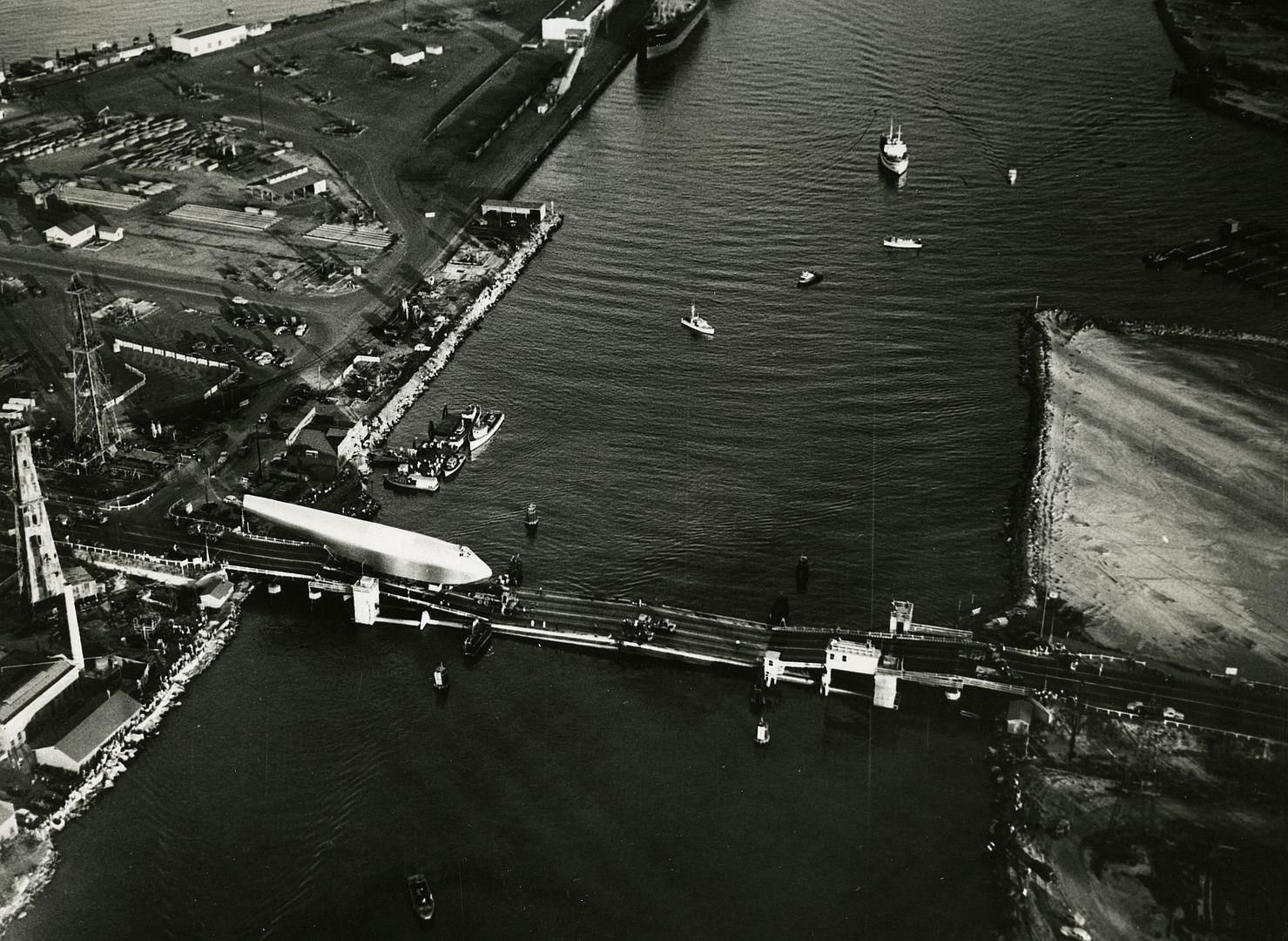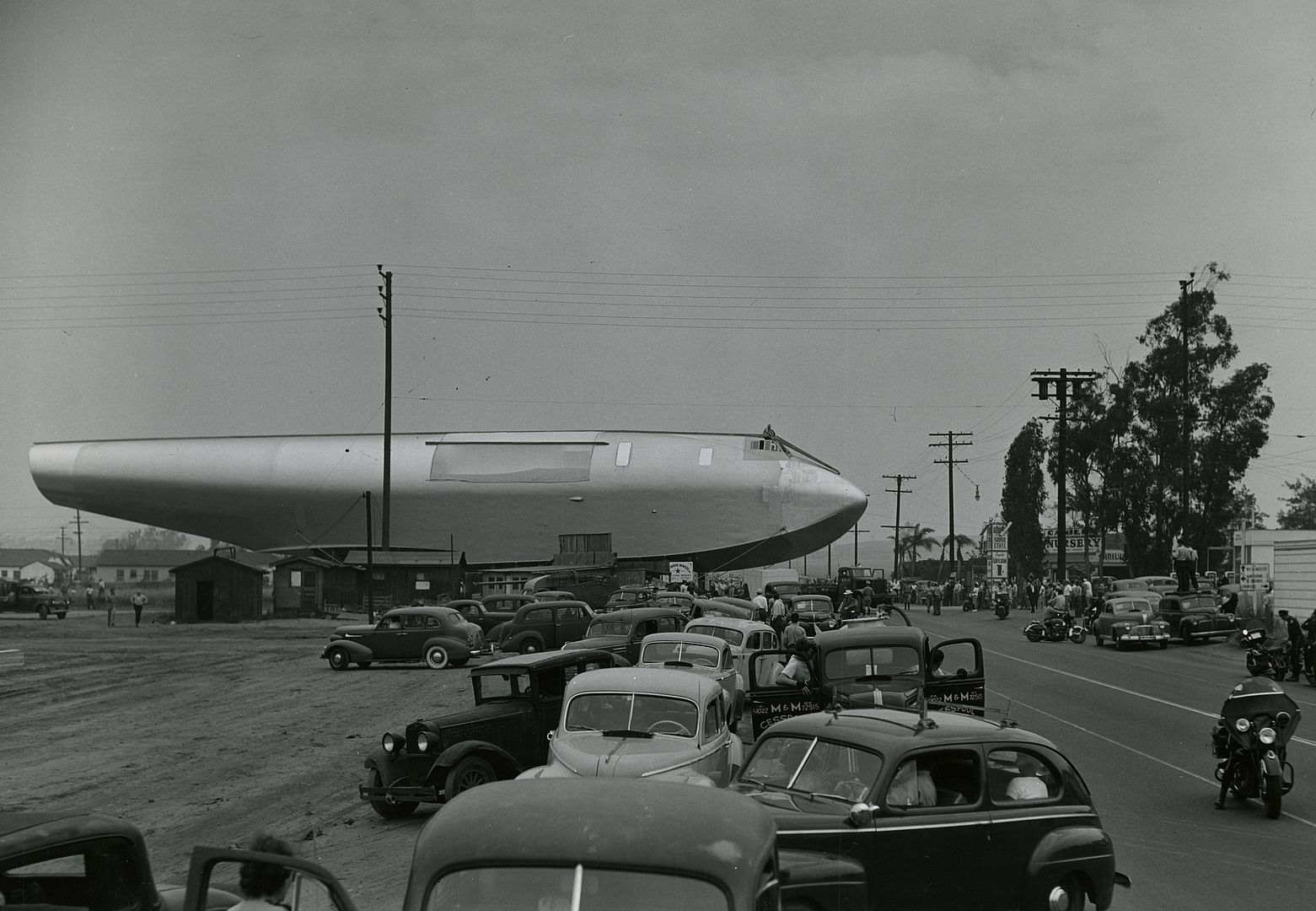 A house moving company transported the airplane on streets to Pier E (now Pier T) in Long Beach, California. They moved it in three large sections: the fuselage, each wing—and a fourth, smaller shipment with tail assembly parts and other smaller assemblies.